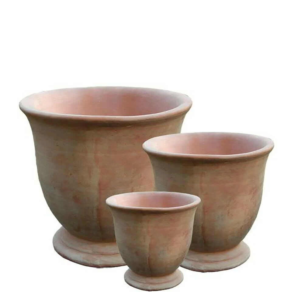 Das 3er Pflanzgefäß Set ADILA, bestehend aus drei runden Pflanzpokalen wird aus Terrakotta handgefertigt und besitzt eine natürliche Farbe sowie einen kleinen, runden Sockel. Das stilvolle Pflanzgefäß Set besitzt die Maße 16x16cm, 23x23cm und 30x33cm (HxDm) und wird ein Blickfang in Ihrem Garten oder auf Ihrer Terrasse.