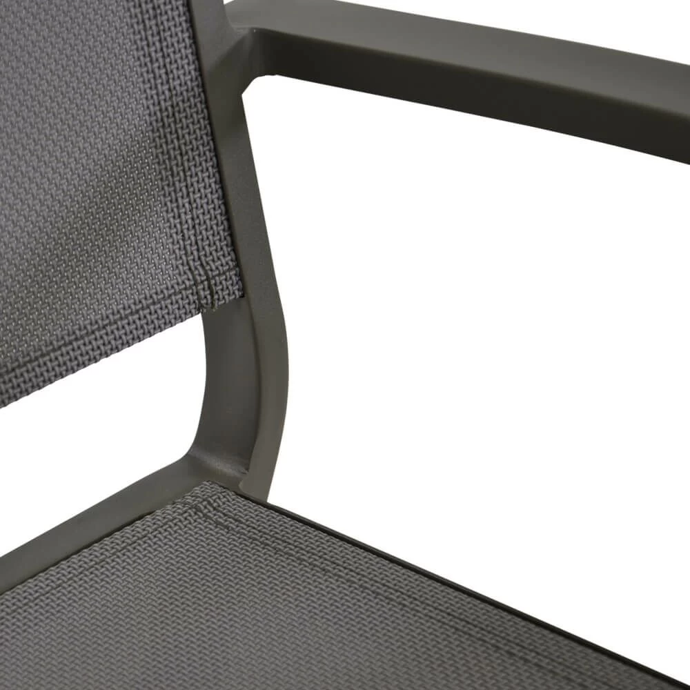 Dieser robuste Gartenstuhl wird unter ständiger Qualitätskontrolle aus Aluminium gegossen und erhält eine farbige Pulverbeschichtung. Die Sitzfläche wird aus Textylen gefertigt, einem strapazierfähigen und robusten Kunststoff. Das Outdoor-Möbelstück ist robust und wetterfest. Zur Reinigung sind Wasser und ein Schwamm ausreichend. Von säurehaltigen Reinigungsmittel wird abgeraten. Diese können die Oberfläche schädigen und zu einem Verlust der Wetterbeständigkeit führen.
