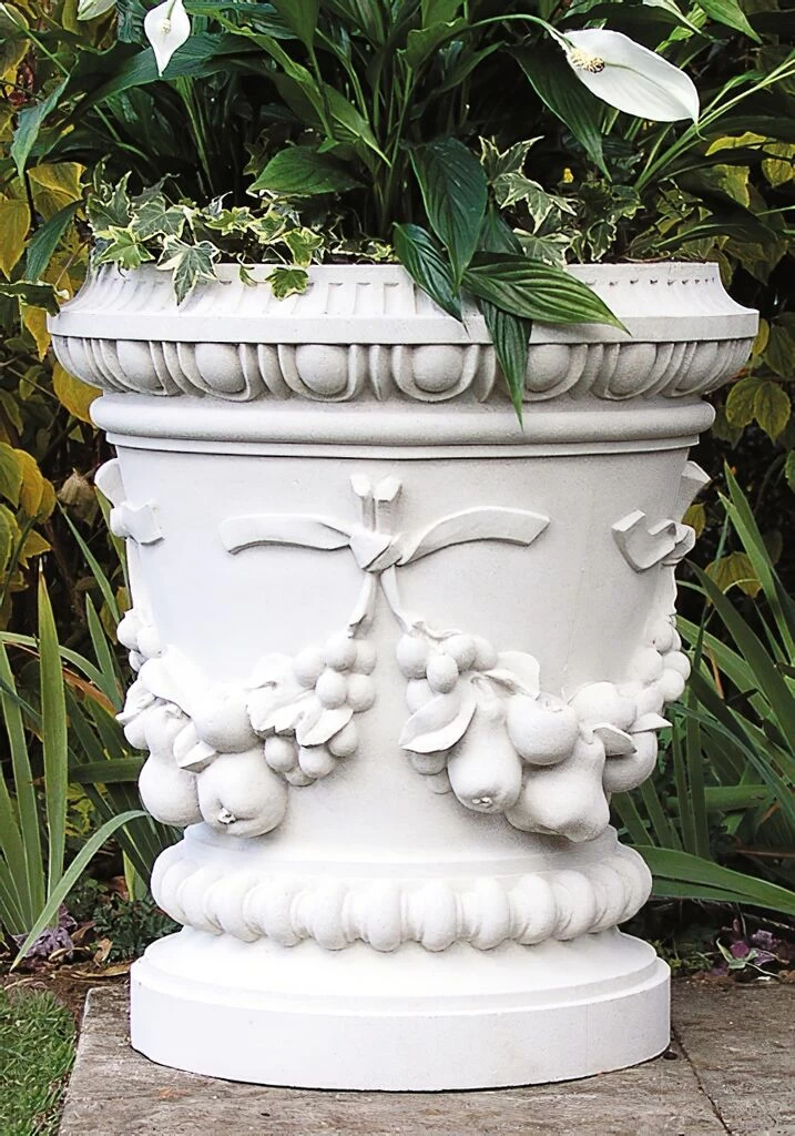 Wavendon Hall zeichnet sich durch ein eindrucksvolles antikes Design aus, welches kunstvoll und stilecht den XXL Vasenkörper ziert. Ein perlenschnurförmiges Band umschließt die Steinamphore, Birnen und Trauben sind liebevoll an Bändern befestigt. Der Rand besticht durch eine reiche Verzierung mit kunstvollen Ornamenten. Aufgrund der großen Gestalt ist das Pflanzgefäß hervorragend für hochwüchsige Gewächse geeignet. Die historische Gartenamphore ist ein Blickfang in jeder Umgebung und lässt Gärten, Verandas sowie Innenräume in antikem Glanz erstrahlen. Nicht nur Gartenliebhaber werden von diesem Pflanzgefäß begeistert sein, auch Liebhaber historischer Amphoren.