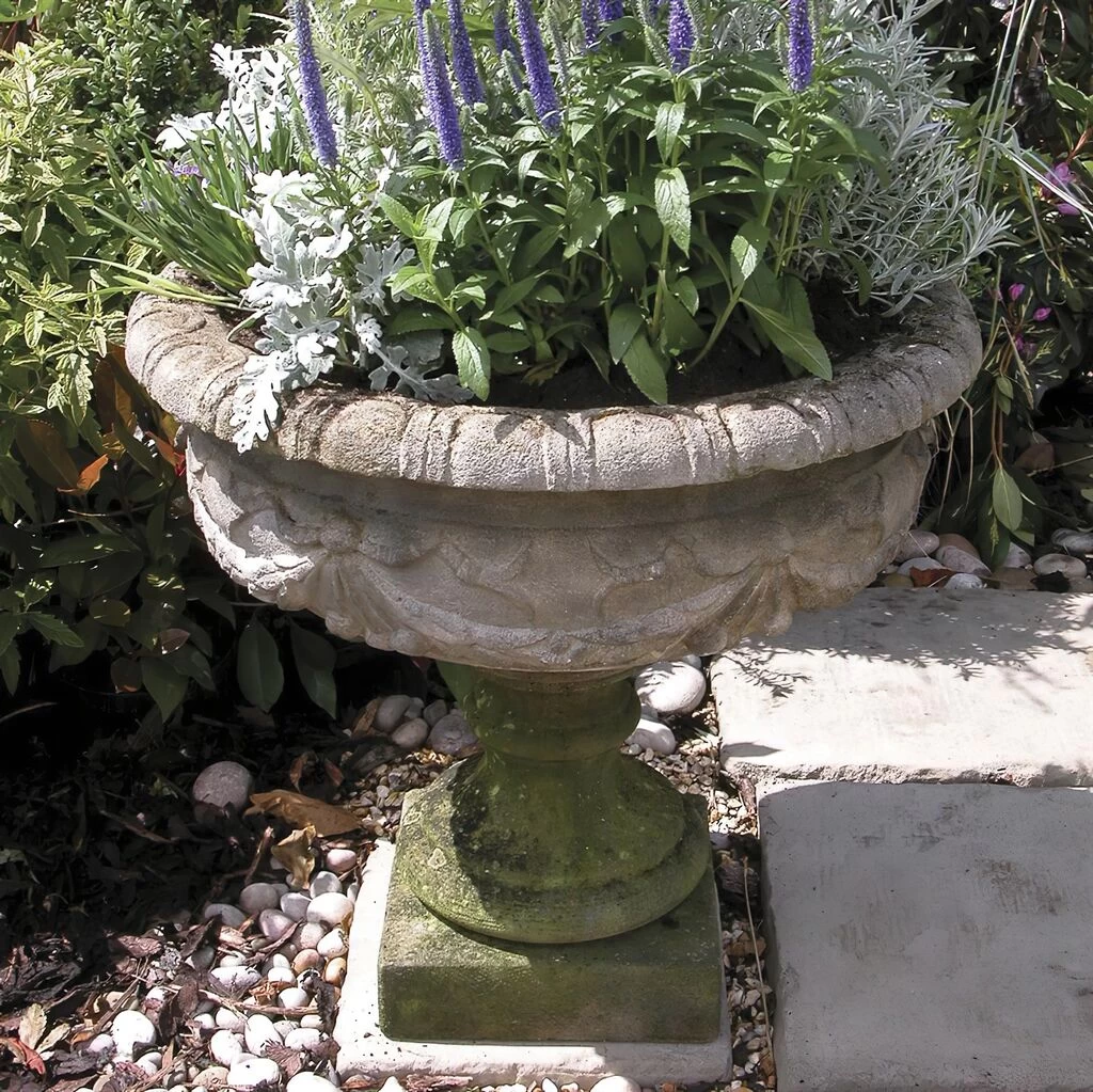 Es wirkt besonders gekonnt in Szenen gesetzt,wenn Pflanzen und Blumen mit der Pflanzamphore farblich korrespondieren oder im gleichen Farbton abgestuft sind. Es ist dabei wichtig, die einzelnen Gestaltungselemente aufeinander abzustimmen. Das Antik Pflanzgefäß kommt in einem Ensemble aus stilvoll gealterten Gartenvasen, Pflanzkübeln und Amphoren gut zur Geltung Auch eine Steinbank mit Antik Finish kann Ihren Klassik-Bereich im Garten um eine hübsche Sitzgelegenheit erweitern. Ist Ihr Garten groß genug, können Sie ruhig mit verschiedenen Stilen spielen und sich verschiedene Gartenbereich unterschiedlich einrichten. Achten Sie nur dabei darauf, dass der Grünbereich nicht überladen wirkt. Mitunter genügt es, eine hübsche Gartenamphore am Ende einer Sichtachse zu platzieren und so eine minimalistische, dafür aber umso eindrucksvollere Gartengestaltung zu erreichen.