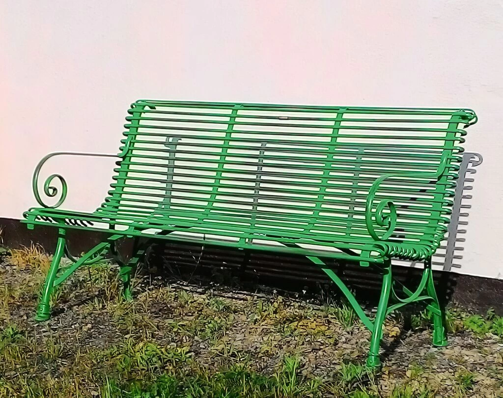Diese 3-Sitzer Gartenbank aus Schmiedeeisen im antiken Design wurde nach Vorlagen aus dem 19. Jahrhundert gefertigt. Damals waren diese Sitzbänke in vielen französischen Gärten und Parkanlagen zu finden. Gefertigt wird die Bank in einer traditionsreichen Kunstschmiede als handwerkliches Unikat. Die farbliche Gestaltung erfolgt nach Ihren Wünschen, innerhalb der RAL Farbpalette können alle Farbwünsche umgesetzt werden. Sie wollen die Gartenbank mit ein paar passenden Stühlen ergänzen? Kein Problem, in unserem Sortiment finden Sie ebenso schmiedeeiserne Gartenstühle und Gartentische für Ihre Sitzecke.
