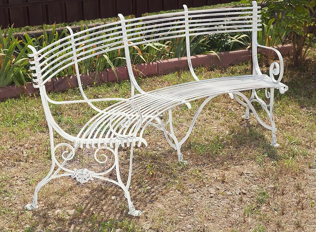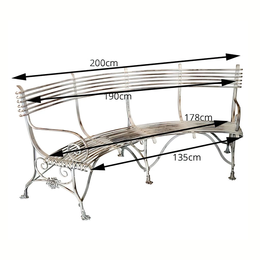 Diese gebogene antike Gartenbank aus Schmiedeeisen wird in einer traditionsreichen Kunstschmiede in Handarbeit gefertigt. Die Vorlagen für diese Gartenbänke stammen aus dem 19. Jahrhundert, in dem man diese Sitzbänke in zahlreichen französischen Gärten und Parks fand. Ein besonderer Hingucker sind die in Form von Löwenklauen gestalteten Füße der Bank. Ob grün, rot oder klassisch weiß, innerhalb der RAL Farbpalette können wir die Rundbank nach Ihren Wünschen gestalten. Falls Sie Ihre Sitzecke mit passenden schmiedeeisernen Möbeln ergänzen wollen, finden Sie in unserem Sortiment außerdem passende Gartenstühle und Gartentische, gerne erstellen wir Ihnen ein unverbindliches Angebot für ein Komplettset nach Ihren Vorstellungen.