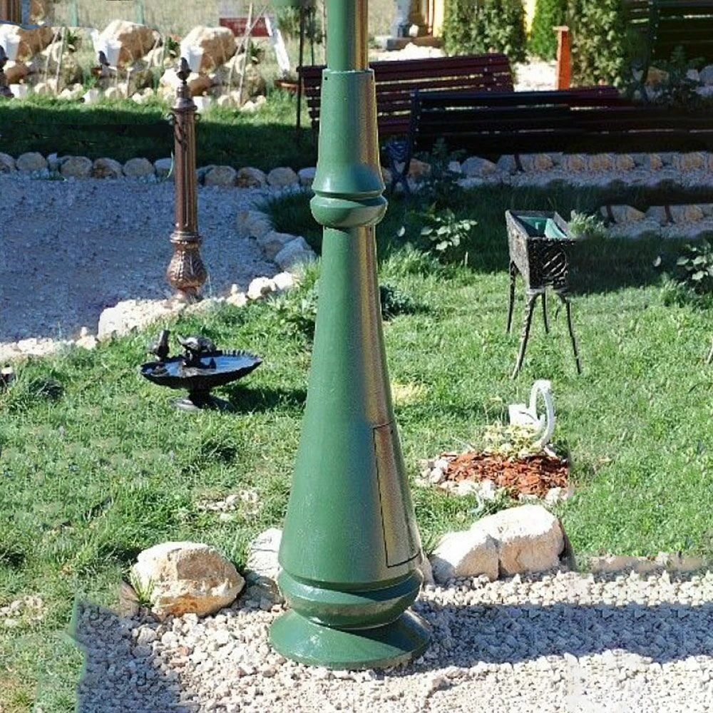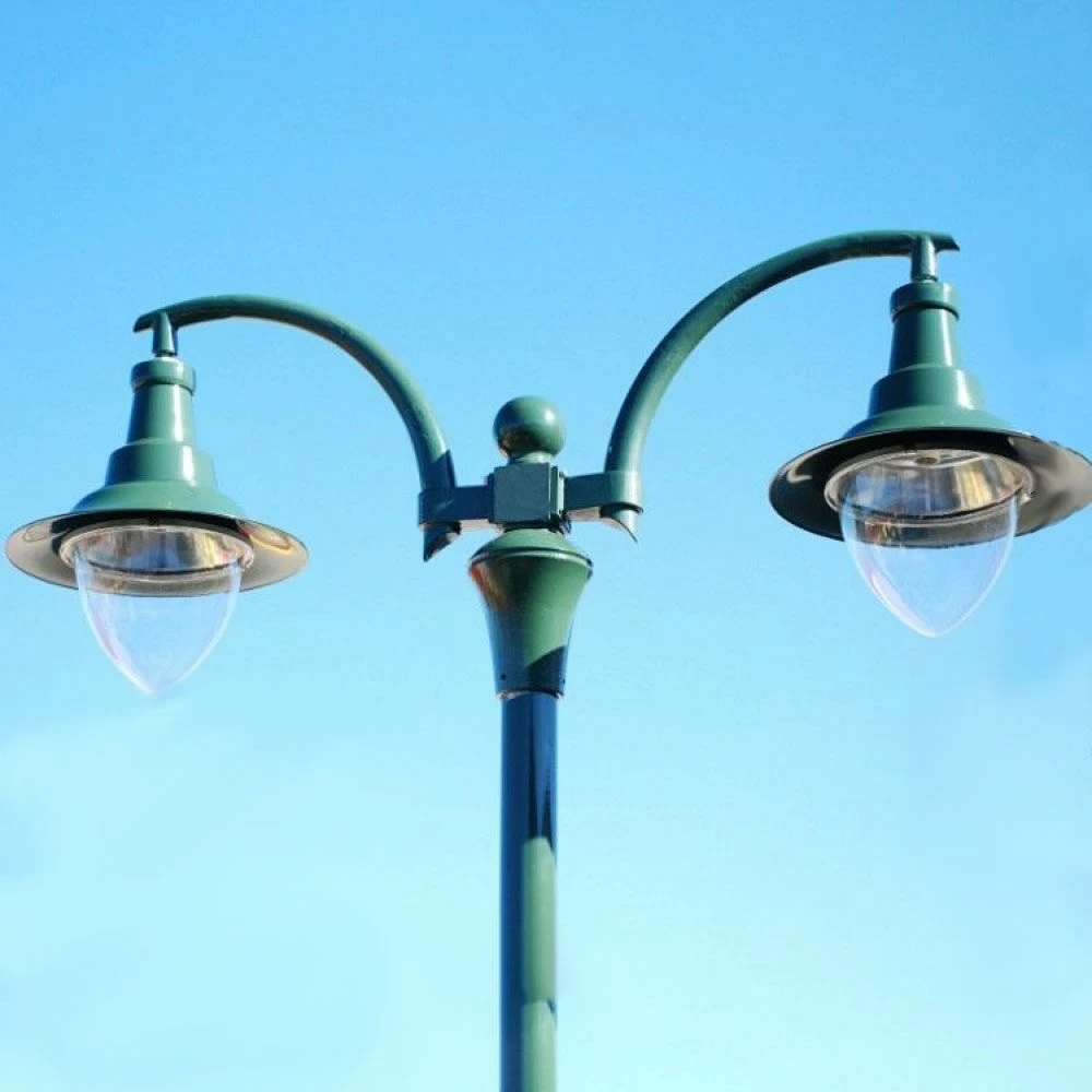 Diese klassische Parkbeleuchtung mit Schirmlampen wird aus Gusseisen gefertigt. Das robuste Material verspricht Langlebigkeit und Resistenz gegenüber Wettereinflüssen. Durch einen innenliegenden Stahlkern mit Flanschplatte kann die Laterne fest mit dem Boden verankert werden. Die Lieferung erfolgt zerlegt.