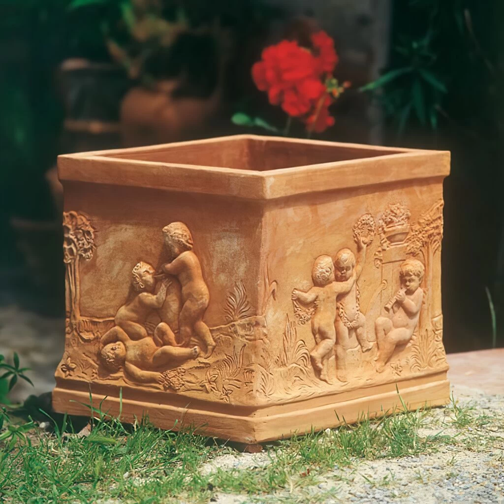 Verspielte Putten mit Musik-Motiv zieren die Oberfläche des Pflanztroges im antiken Look. Detailliert bearbeitet und im warmen Farbton, stellt der Blumenkübel ein besonderes Highlight im Garten, auf der Terrasse oder im Blumenbeet dar. Die Frostbeständigkeit und ein Wasserablauf im Boden runden diese Gartendeko ab.
