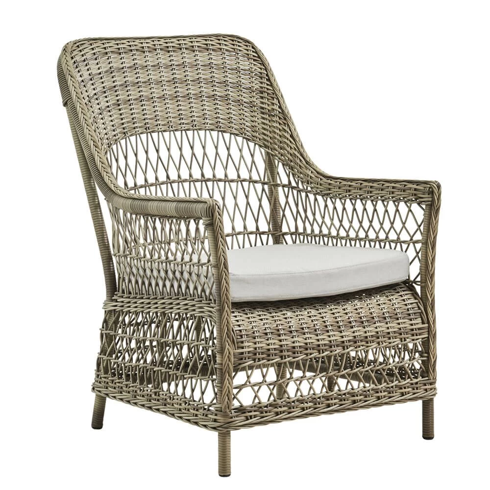 Das Design für diesen Outdoor Loungechair stammt aus Dänemark und hat alte dänische Korbmöbel und den britsichen Kolonialstil zum Vorbild. Der Sessel wird aus Aluminium gefertigt und anschließend mit einer Kunstfaser in Handarbeit umflochten. Die Materialien machen den Gartensessel wetterfest. Ein passendes Sitzkissen kann zu diesem antikgrauen Loungesessel dazu gewählt werden.