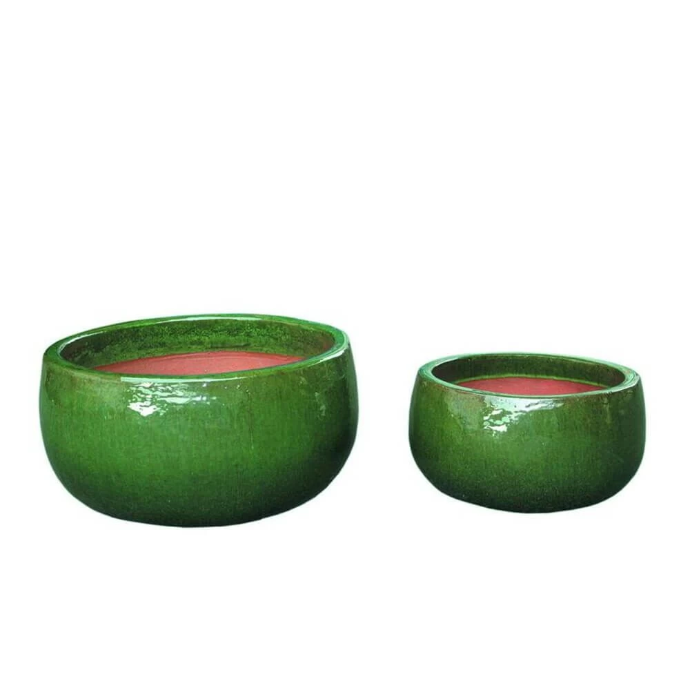 Moderne runde Pflanzschalen aus glasierter Keramik in Apfelgrün. Im Lieferumfang enthalten sind 2 Schalen mit den Maßen 18x32cm und 25x44cm (HxDm). Farbliche Abweichungen sind möglich.