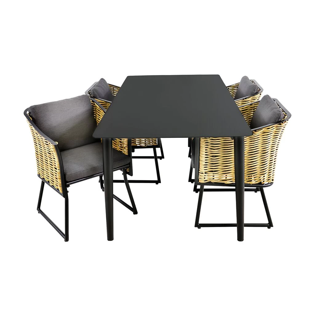 Dieser robuste Gartenstuhl wird unter ständiger Qualitätskontrolle mit einem Aluminiumgestell in Anthrazit gefertigt. Sitz- und Rückenkissen sind mit einem 270 gr/m^2 Oelfin-Bezug sowie mit einem Baumwoll-Inlay hergestellt. Polyethylen bildet ein natürlich wirkendes Polyrattan-Geflecht Die Outdoor-Möbelstücke sind wetterfest. Zur Reinigung sind Wasser und ein Schwamm ausreichend. Von säurehaltigen Reinigungsmittel wird abgeraten. Diese können die Oberfläche schädigen und zu einem Verlust der Wetterbeständigkeit führen.