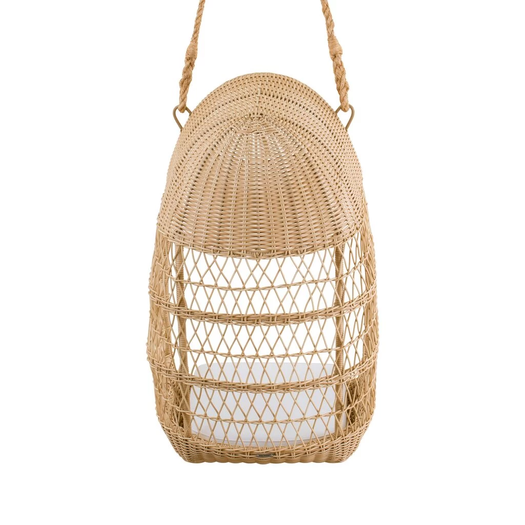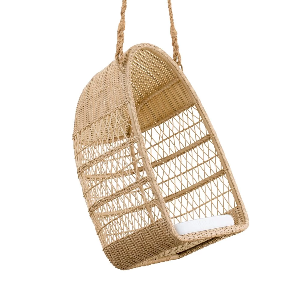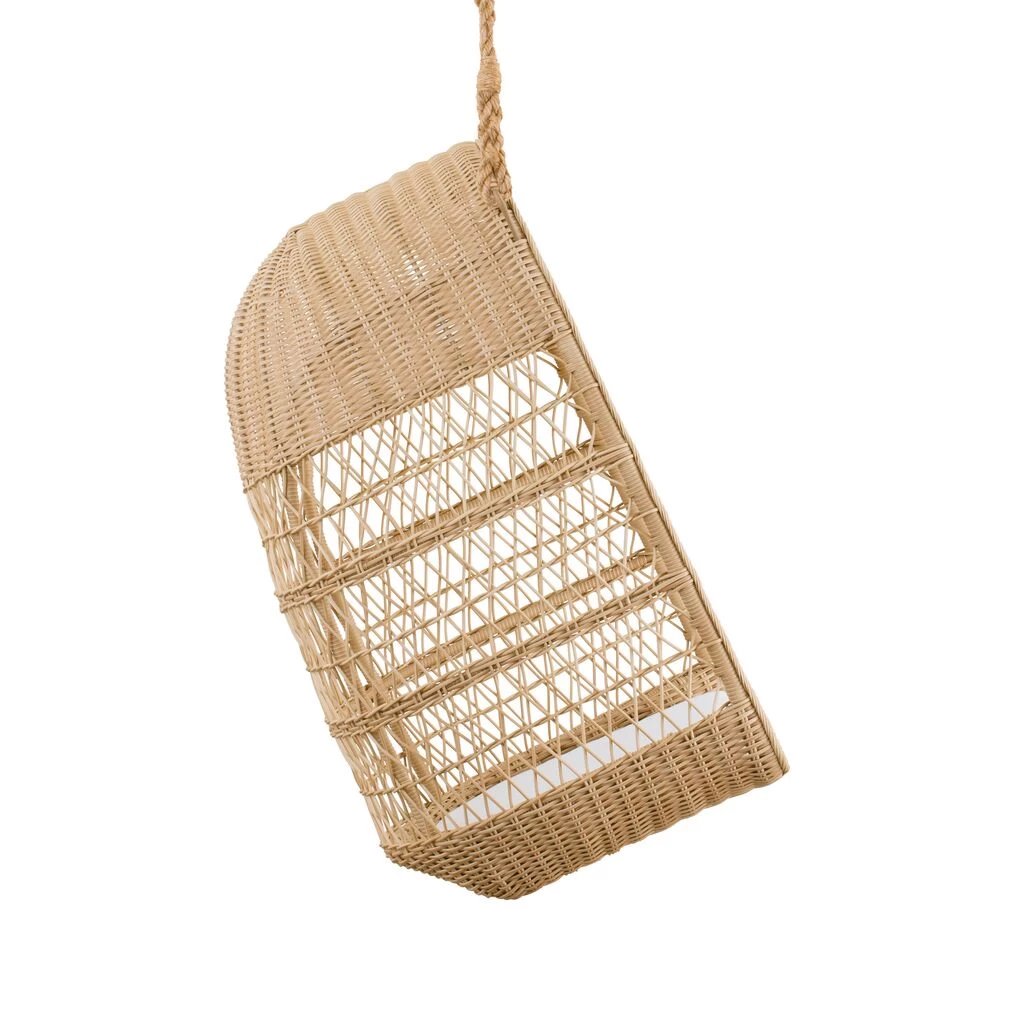 Der Hängesessel trotzt Sonneneinstrahlung und anderen äußeren Wettereinflüssen. In Handarbeit wird das leichte Gestell aus Aluminium mit einer Synthetik-Faser umflochten, die aussieht wie echtes Rattan, jedoch absolut wetterbestädnig ist. Mit Hilfe des mitgelieferten Seils kann der Geflechtsessel aufgehangen werden.