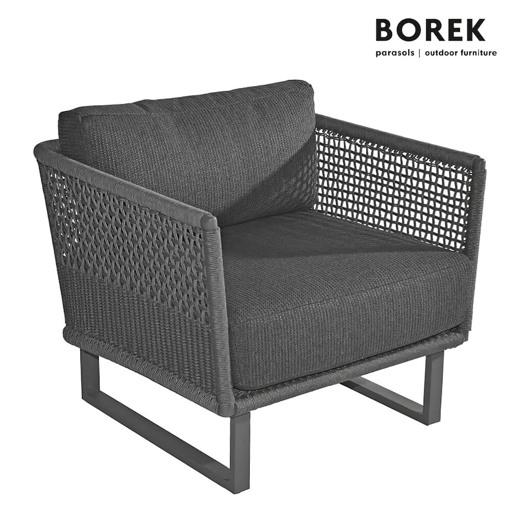 Dieser Gartensessel aus dem Hause Borek überzeugt mit einem modernen Design, das an verträumte Stunden im Spätsommer denken lässt. Das pulverbeschichtete Aluminiumgestell ist mit einer Bespannung aus Ardenza-Seil überzogen. Ardenza ist reißfest, UV-beständig, resistent gegenüber Temperaturen zwischen -40 bis +80 Grad Celsius und extrem widerstandsfähig gegenüber Witterung.