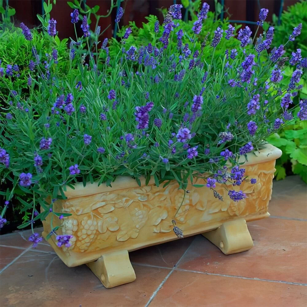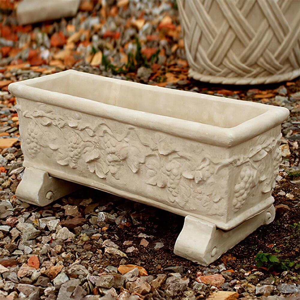 Der eckige Pflanztrog ist mit Weinblättern und Trauben geschmückt. Gefertigt wird das robuste Pflanzgefäß aus wetterbeständigem Steinguss in verschiedenen Farben nach Wahl. Der Trog eignet sich ideal als Blickfang auf Terrassen oder Balkonen.