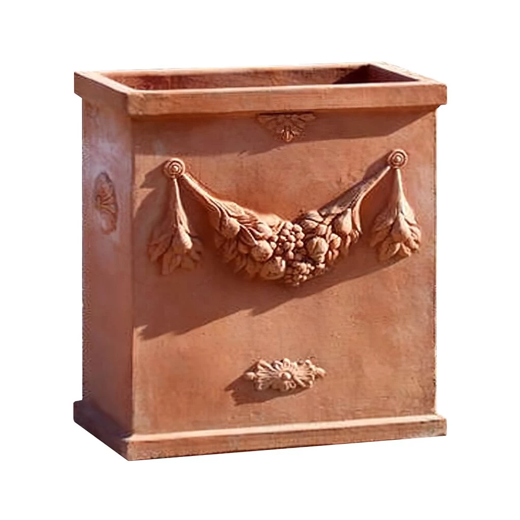 Eckig und mit floralen Ornamenten verziert, ist der Pflanztrog das ideale Dekoobjekt im Gartenbereich. Das Pflanzgefäß ist witterungsbeständig und hält auch niedrigen Temperaturen mühelos Stand. Staunässe wird über eine Loch im Boden verhindert.