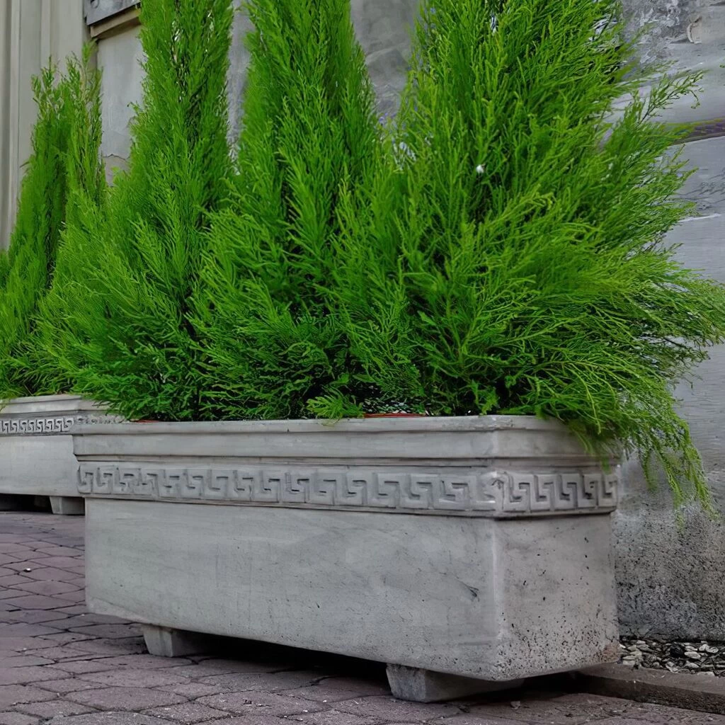 Der eckige Pflanztrog wird aus Steinguss in verschiedenen Farben hergestellt. Ein antikes Muster schmückt die Außenseite des Pflanzgefäßes. Die Pflanztöpfe sind sowohl allein wie auch in Kombination mit mehreren ein eleganter Hingucker auf der Terrasse oder im Garten.