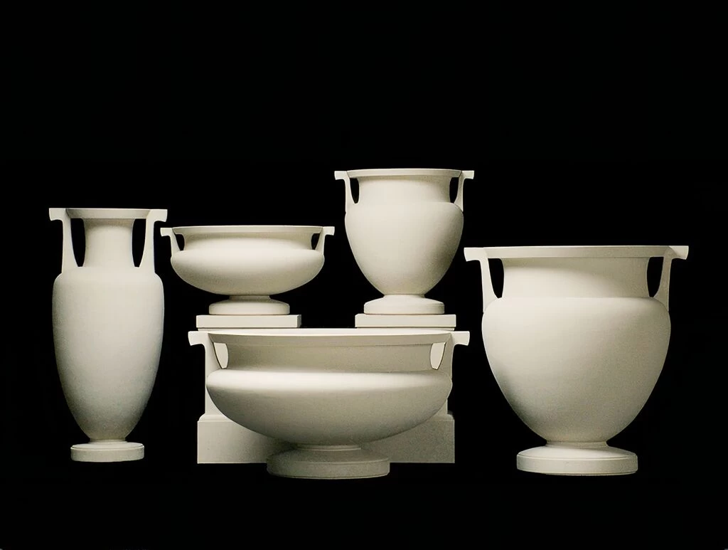 Stilvolle Gartendekoration mit schönen Steinamphoren und Pflanzschalen