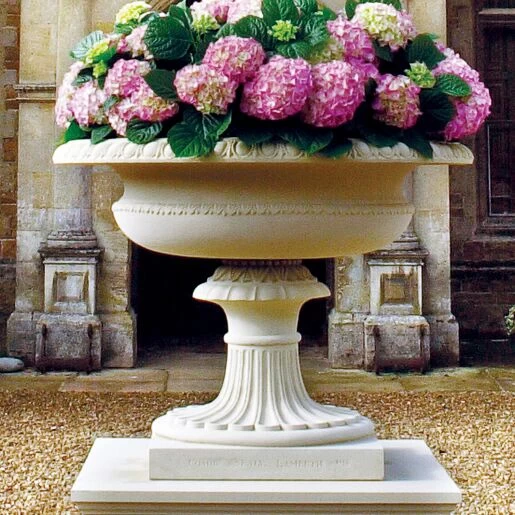 Tudor Hall ist eine ausdrucksstarke, stilvolle englische Pflanzvase aus Stein, welche mit einer romantischen und ästhetischen Optik verzaubert. Der massive Blumentopf zeichnet sich durch ein einzigartiges Design aus. Getragen von einem quadratischen Steinsockel zieht sich der antike Charakter der Gartenamphore bis zum schwungvoll gestalteten und reich mit Ornamenten verzierten Rand hin, welcher den Blumentrog abschließt. Der Stiel zeigt sich in einem eleganten englischen Design. Der Vasenkörper ist breit gestaltet, wodurch sich ausladende Gewächse frei entfalten können. Die besondere Gestalt der Steingussamphore macht sie zu einem idealen Blickfang in Gartenanlagen, auf Verandas, aber auch im Innenbereich. Vielseitig einsetzbar ist die Blumenvase hervorragend geeignet als Vogelbad oder Wasserbecken.