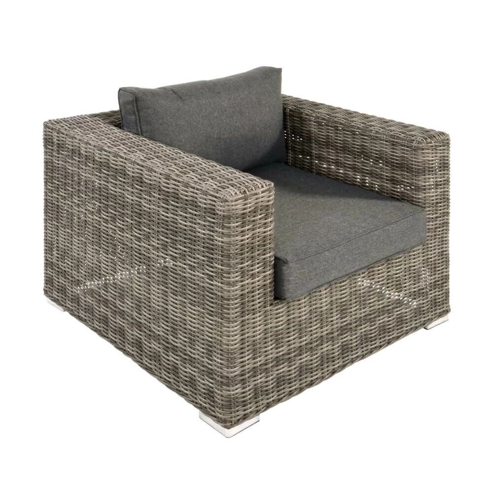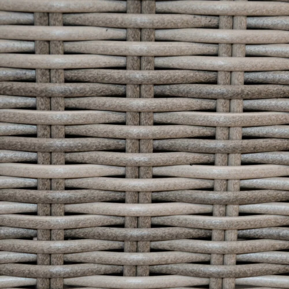 Dieses robuste Loungelement wird unter ständiger Qualitätskontrolle aus Aluminium gefertigt. Das Gestell wird mit einem Polyethylen-Geflecht in Rattanoptik überzogen. Die Stränge sind 6×2,5 mm stark. Die Sitzhöhe beträgt 33 cm, die Höhe der Armlehnen liegt bei 65 cm. Das Outdoor-Möbelstück ist beständig gegenüber Witterung und kann ganzjährig im Außenbereich eingesetzt werden. Die 10 bis 20 cm dicken Auflagen werden aus Spun-Polyester mit einem Schaumstoff-Baumwoll-Inlay gefertigt. Das Polyester hat eine Dichte von 250 gr/m^2. Zur Reinigung sind Wasser und ein Schwamm ausreichend. Von säurehaltigen Reinigungsmittel wird abgeraten. Diese können die Oberfläche schädigen und zu einem Verlust der Wetterbeständigkeit führen.