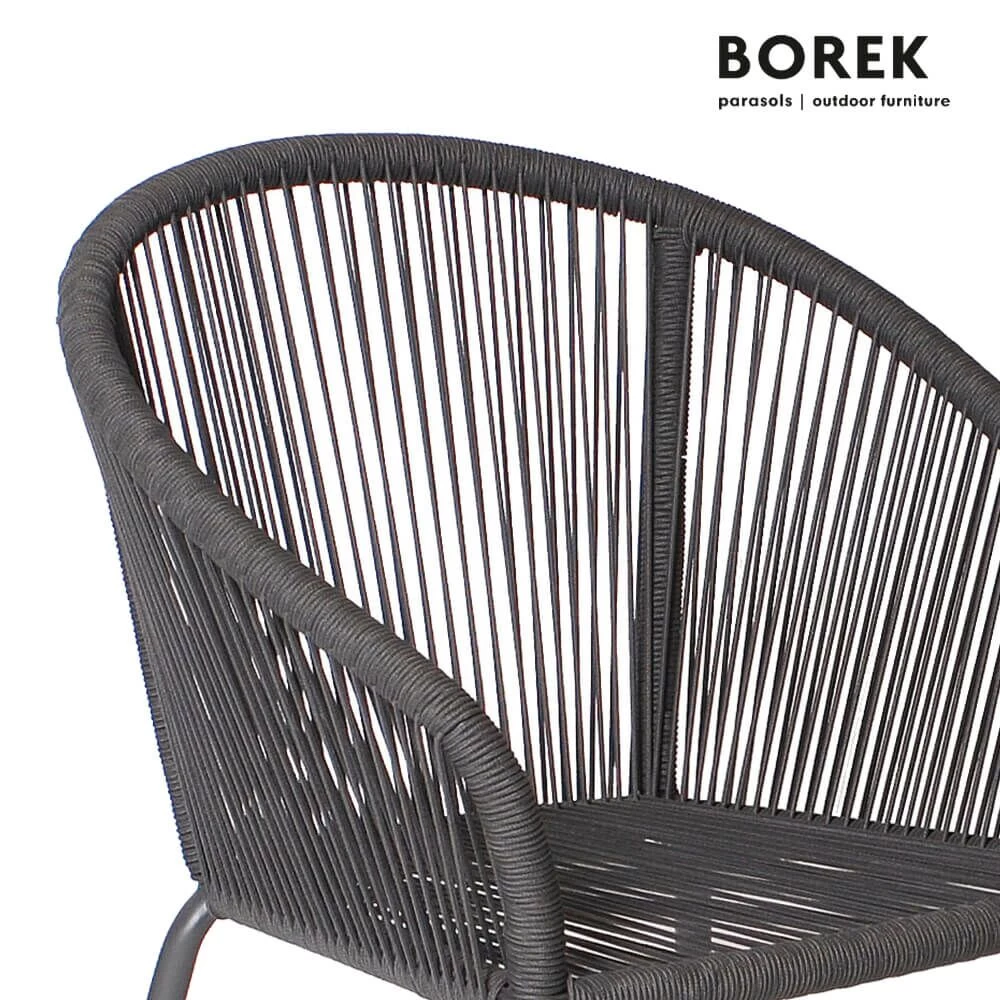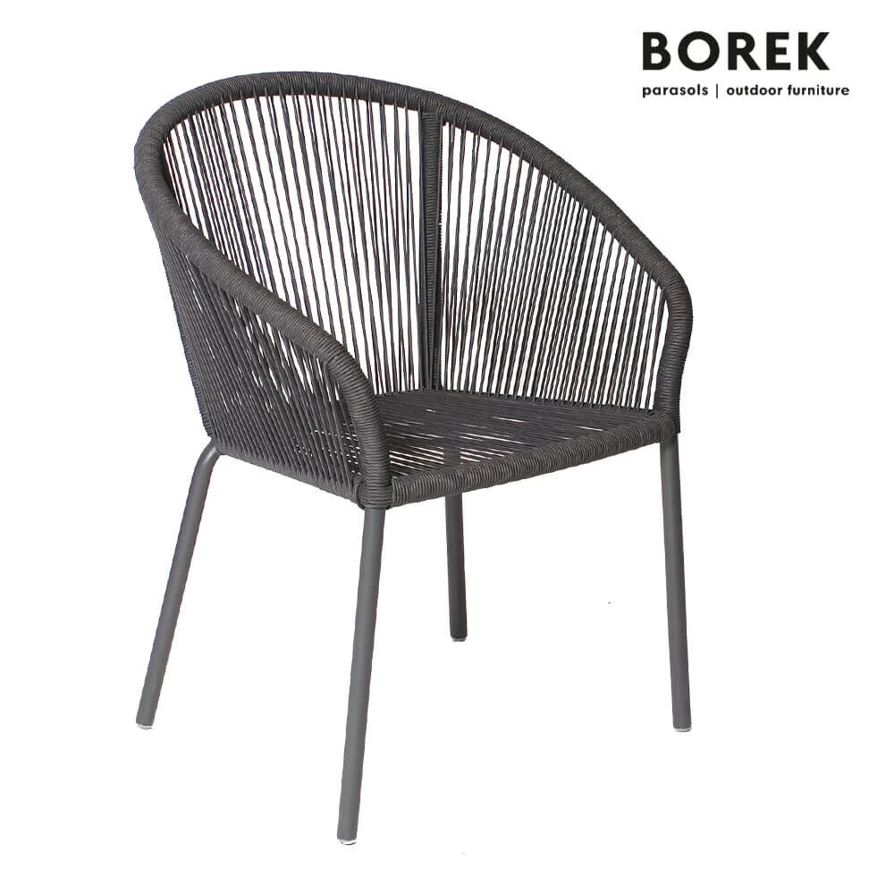 Dieser Stuhl des niederländischen Gartenmöbel-Herstellers Borek besticht durch ein modernes Design und ein hohes Maß an Komfort. Das pulverbeschichtete Gestell aus Aluminium ist in einem edlen Grau gehalten. Die dunkel-graue Bespannung aus Ardenza-Seil harmoniert mit diesem Farbton. Das synthetische gefertigte Material ist reißfest, wetterfest und UV-beständig. Die breite Sitzfläche und die runde Rückenlehne bieten höchsten Sitzkomfort. Ein dazu passende Kissen können Sie ebenfalls in unserem Shop online bestellen. Mit einem der Gartentische aus unserem Angebot stellen Sie sich eine Esstischgruppe nach Ihren Vorstellungen zusammen.