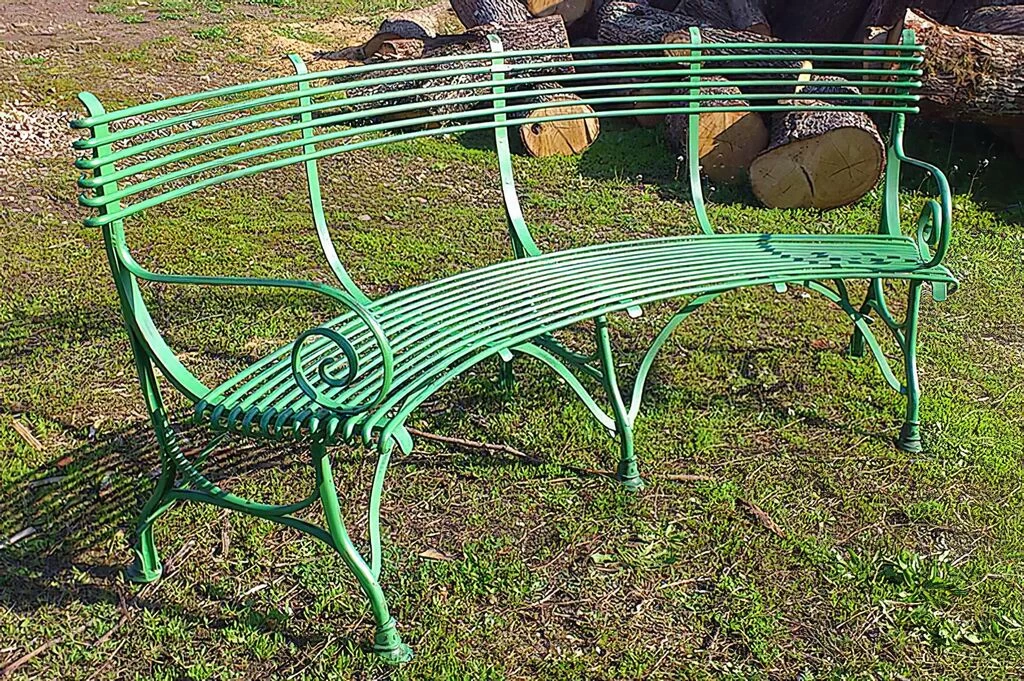 Die Vorlagen für diese gebogene Eisen Gartenbank im antiken Design stammen aus dem 19. Jahrhundert. Zu dieser Zeit fand man diese Gartenbänke in vielen französischen Gärten und Parks. Unsere nostalgische Sitzbank wird aus hochwertigem Schmiedeeisen in Handarbeit in einer traditionsreichen Kunstschmiede gefertigt. Ein besonderes Highlight sind die in Form eines Pferdehufs gestalteten Füße der Bank. Ob grün, rot oder klassisch weiß, der farblichen Gestaltung sind innerhalb der RAL Farbpalette keine Grenzen gesetzt. In unserem Sortiment finden Sie ebenso passende Gartenstühle und Gartentische, gerne erstellen wir Ihnen ein unverbindliches Angebot für ein Gartenmöbelset nach Ihren Vorstellungen.
