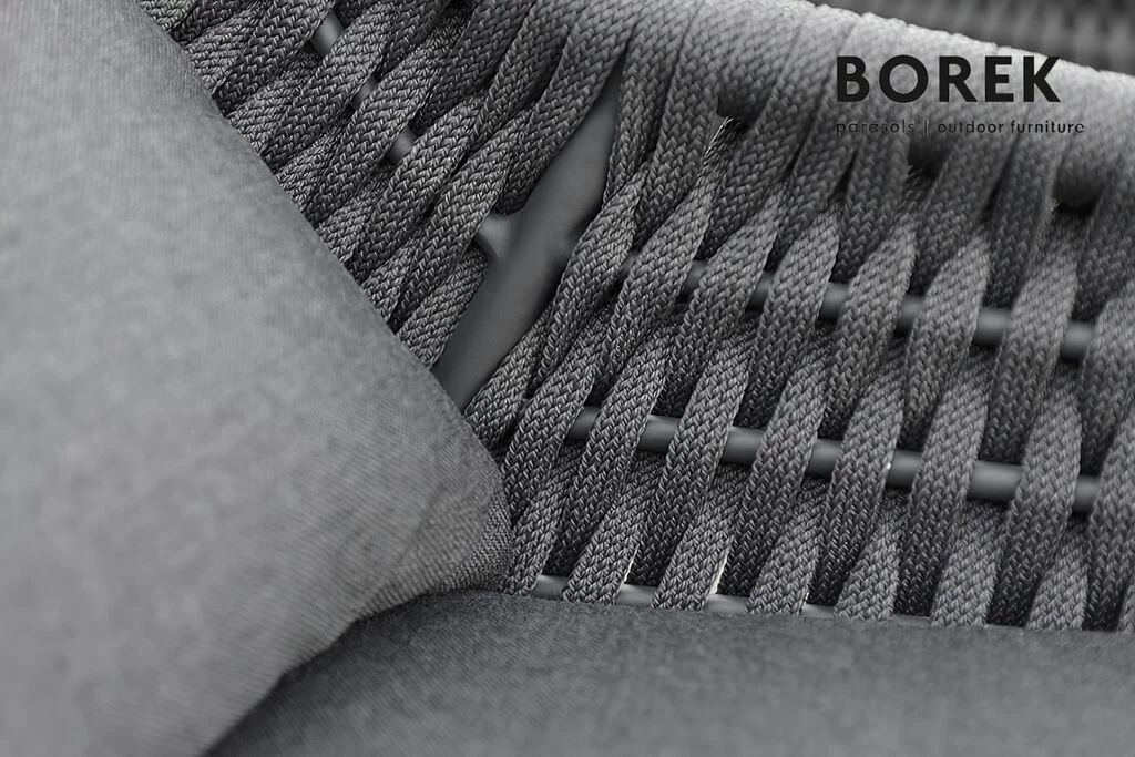 Die Gartenmöbel des Herstellers Borek zeichnen sich durch eine dauerhafte Stabilität und ein modernes Design aus. Eine hochwertige Aluminiumlegierung, die bei 180 Grad pulverbeschichtet wurde, bildet zumeist das Gestell der Möbel. Hinzu kommen hochwertige Materialien für die Bespannung. Der Gartensessel ist frost- und hitzbeständig sowie pflegeleicht. Neben Gartenstühlen bietet der Hersteller auch Loungemöbel, Gartenliegen und Sonnenschirme, die Sie ebenfalls in unserem Shop online bestellen können. Das Ardenza-Seil kann mit dem Borek Fabric Cleaner gerinigt und mit dem Borek Fabric Protector geschützt werden. Zu diesem Outdoor-Möbelstück ist eine passende Abdeckhülle erhältlich.
