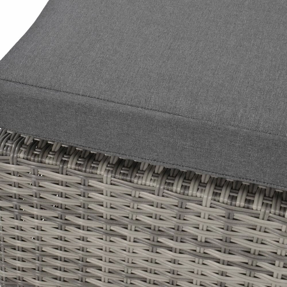 Dieser Gartenhocker wird unter ständiger Qualitätskontrolle aus Aluminium gefertigt. Das Gestell wird mit einem Polyethylen-Geflecht in Rattanoptik überzogen. Die Stränge sind 10 mm stark. Die Outdoor-Möbel sind beständig gegenüber Witterung und können ganzjährig im Außenbereich eingesetzt werden. Die 8 cm dicke Auflage wird aus Olefin (245 gr/m^2) mit einem Schaumstoff-Baumwoll-Inlay gefertigt. Zur Reinigung sind Wasser und ein Schwamm ausreichend. Von säurehaltigen Reinigungsmittel wird abgeraten. Diese können die Oberfläche schädigen und zu einem Verlust der Wetterbeständigkeit führen.