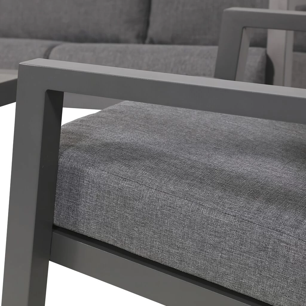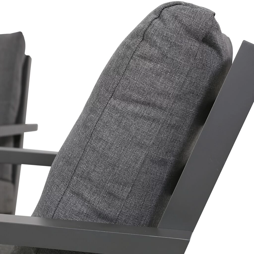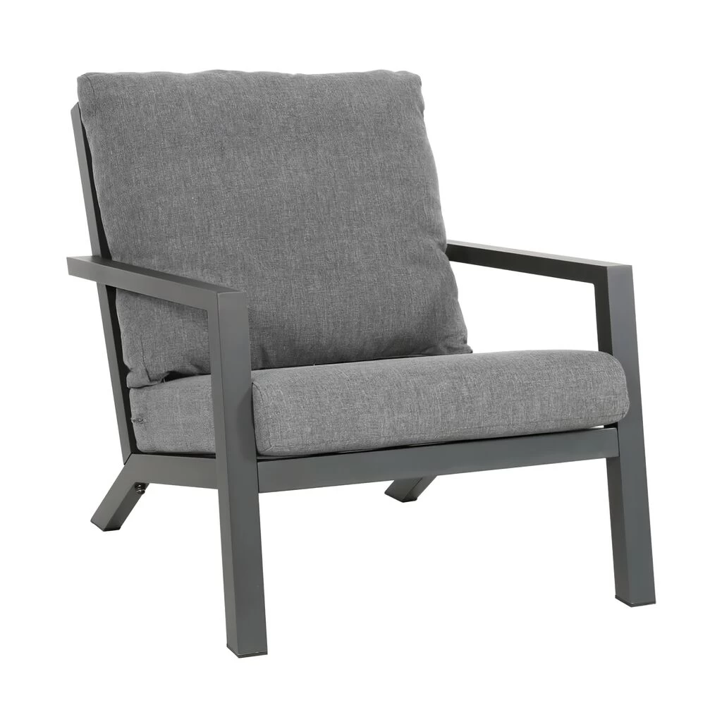 Dieser robuste Gartenstuhl wird unter ständiger Qualitätskontrolle aus Aluminium gegossen und erhält eine graue Beschichtung. Das Outdoor-Möbelstück ist robust und wetterfest. Olefin Auflagen sorgen für einen angenehmen Sitzkomfort. Das Inlay wird aus einem Baumwoll-Schaumstoff-Gemisch gebildet. Zur Reinigung sind Wasser und ein Schwamm ausreichend. Von säurehaltigen Reinigungsmittel wird abgeraten. Diese können die Oberfläche schädigen und zu einem Verlust der Wetterbeständigkeit führen.