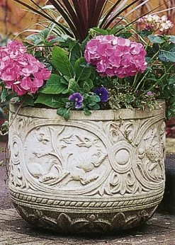 Dieses Pflanzgefäß aus Stein besticht durch Ästhetik, Größe und mit romantischen Charme. Egal ob bei Sonnenschein, Regen oder Schnee, Elcot Park ziert jeden Garten mit einer einzigartigen Ausstrahlung. Ein steinernes Holzgeflecht umschlingt den Vasenkörper. Hierdurch wird der Blumentopf zu einem historisch wirkenden Blickfang, welcher Terrassen, Gärten und Eingangsbereiche in antikem Flair erstrahlen lässt. Sowohl kleine als auch hochwüchsige Pflanzen finden ein stilgerechtes Zuhause. Ein Kordelband umrundet die Steinamphore und schließt diese nach oben und unten ab. Das Pflanzgefäß ist nicht nur hervorragend für den Innenbereich geeignet, sondern setzt auch auf Grünflächen, im Blumenbeet oder auf Kies- und Pflasterwegen ein eindrucksvolles Highlight.