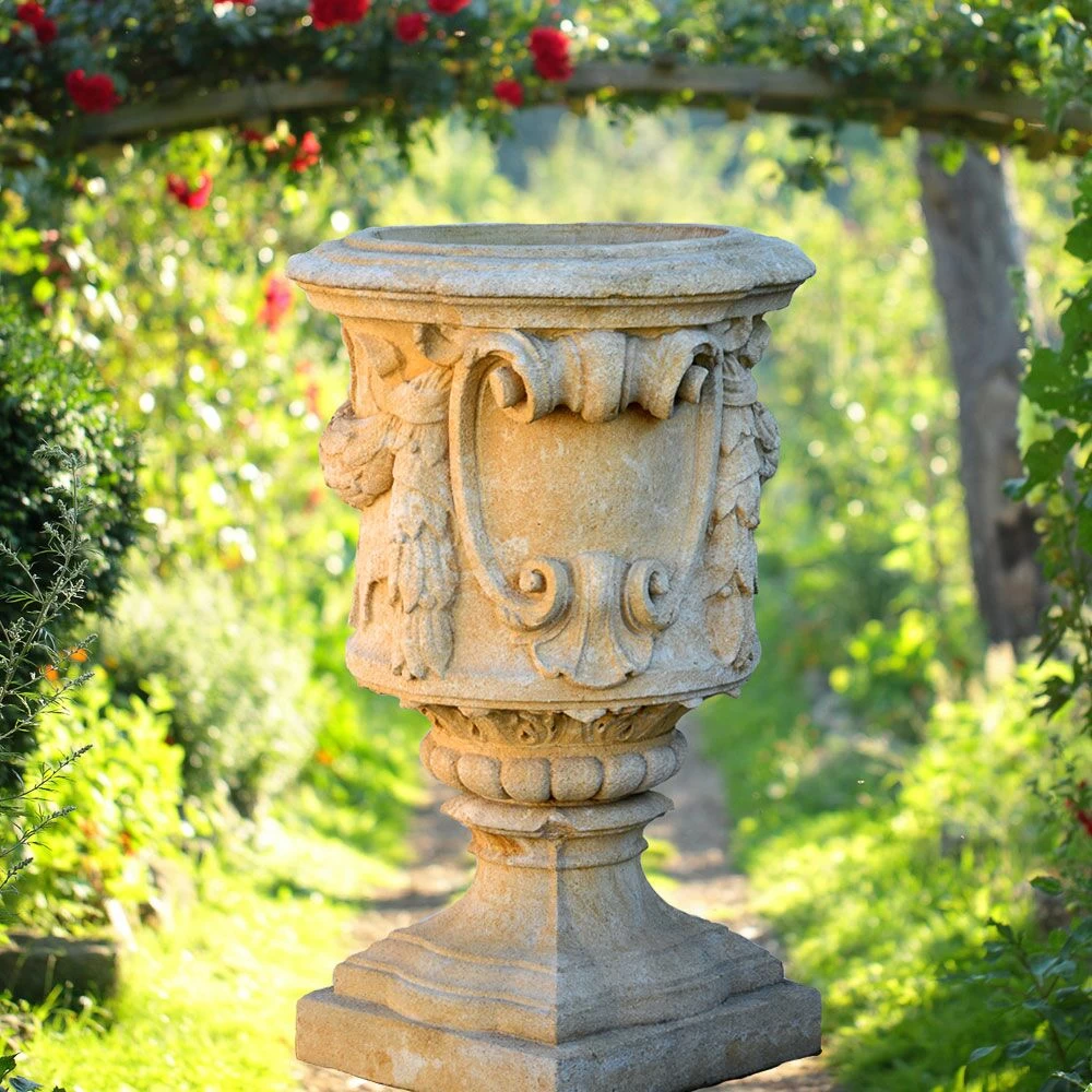 Dieses Steingefäß mit seinen prächtigen Verzierungen ist nicht nur ein exquisites Pflanzgefäß, sondern auch ein bildhauerisches Kunstwerk für Ihren Garten. Der quadratische Sockel gibt dem antiken Pflanztopf die nötige Standsicherheit und schützt vor Bodennässe und Verunreinigungen. Außerdem kommt das historische Gartengefäß auf diese Weise stets perfekt zur Geltung. Sie können dieses große Pflanzgefäß ganzjährig im Vorgarten, im Blumenbeet oder im Park verwenden, denn die hohe Qualität der Werkstoffe sowie deren sorgsame Verarbeitung machen das Produkt aus Steinguss frostsicher und winterfest. Wir gewährleisten eine erstklassige Qualität unserer Steindekorationen, weshalb wir unseren Kunden auf jede Steingussarbeit eine zweijährige Garantie ab dem Kaufdatum geben. Von historisch über klassisch bis modern – in unserem Onlinekatalog finden Sie zahlreiche weitere Pflanzvasen, Gartenamphoren, Blumentöpfe, Steingefäße und Übertöpfe als Gartendeko aus wertvollem Elbsandsteinguss.