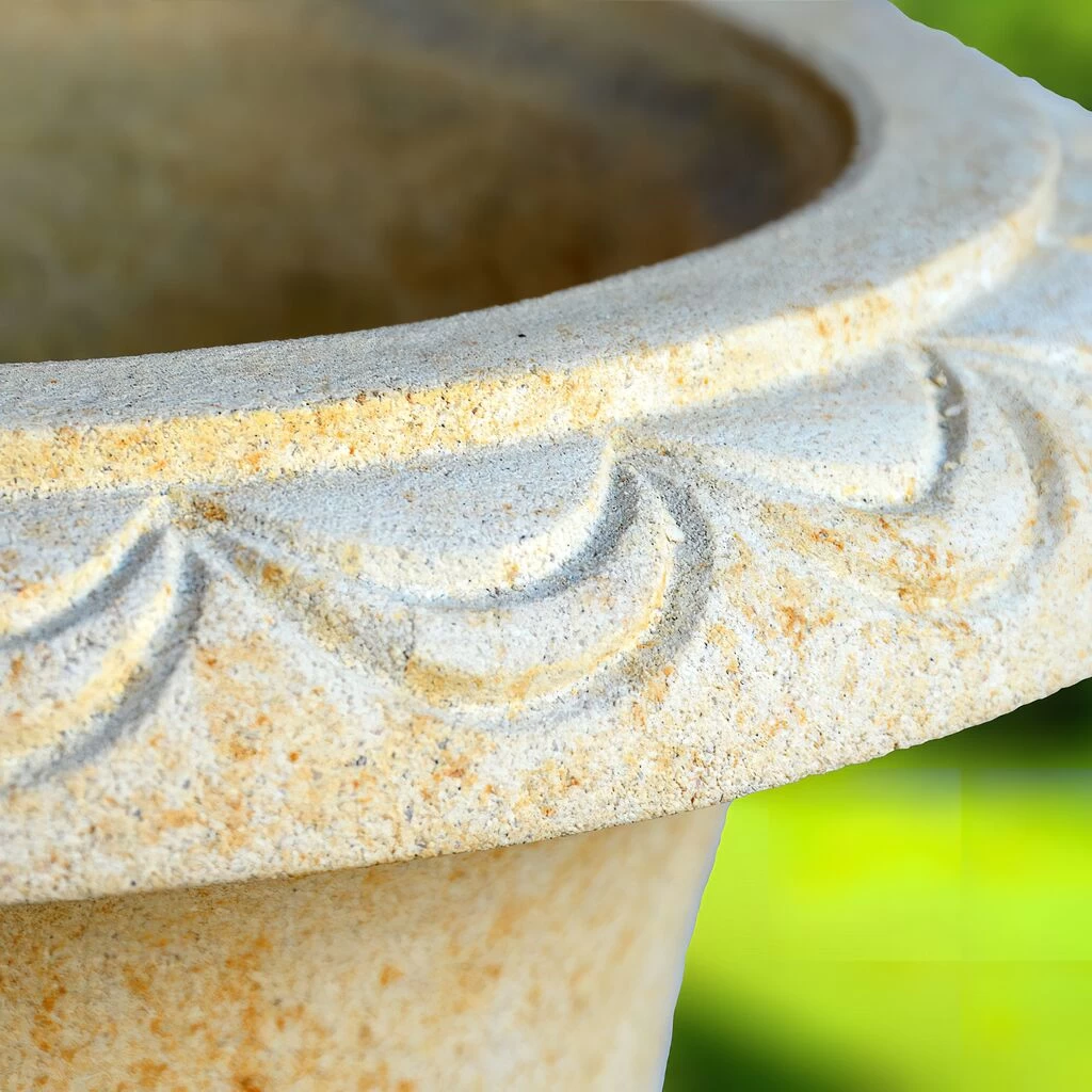 Diese historische Gartenvase gehört zu einer ganzen Serie von Pflanzvasen, Amphoren und Pflanzentrögen, die sich durch ihre hohe Qualität und die detailreiche Gestaltung auszeichnen. Alle Pflanzgefäße dieser Reihe werden in liebevoller Handarbeit durch eine Bildhauerei produziert – billige Massenware erhalten Sie bei uns nicht. Als Vorlage dient meist ein beliebtes Original-Pflanzgefäß, hergestellt von berühmten Künstlern und Steinmetzen. Um diese edlen Kopien zu fertigen, verwenden wir ein patentiertes Steinguss-Verfahren. Dabei werden zunächst Abdrücke der Originale erstellt, die als Grundlage für eine Gussform dienen. Die Gussformen werden dann mit einem Kunststein befüllt, der Rest ist Handarbeit. Alle Gartenvasen und Pflanzgefäße werden so stark verdichtet, dass sie später eine hohe Festigkeit aufweisen und sehr robust sind. Für diese Gartenamphoren wird ein hochwertiger Sandsteinguss verwendet, bestens geeignet für die ganzjährige Gartendekoration. Die schöne Maserung, welche der Sandstein hinterlässt, und der warme Farbton passen hervorragend in die natürliche Umgebung. Wir empfehlen, die gesamte Gartendekoration aufeinander abzustimmen, und die historische Gartenvase mit anderen Gartendeko-Objekten aus Stein zu kombinieren. So lassen sich einfach klassische, moderne oder romantische Gärten gestalten.