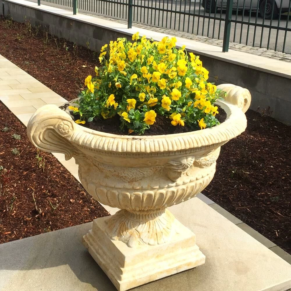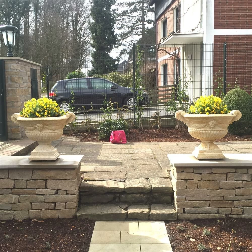 Diese historische Gartenvase wurde speziell für den Einsatz im Außenbereich konzipiert. Während man früher solch klassische Pflanzgefäße über Winter in den Wintergarten oder in eine Orangerie trug, können moderne Steinvasen ohne weiteres im Freien verbleiben. Diese edle Amphore ist nicht nur frostsicher und wetterfest, sondern auch sehr robust. Für die Herstellung wird nur bester Elbsandsteinguss verwendet, in einem aufwändigen Prozess wird der Stein von Hand modelliert und verdichtet, so dass diese hohe Festigkeit entsteht. In der abschließenden Oberflächenbehandlung erhält dieser außergewöhnliche Blumentopf seine schöne Patina. Bei der Gartengestaltung mit verschiedenen Pflanzgefäßen, Steintrögen und Amphoren gibt es diverse Möglichkeiten, um sich zauberhafte Lieblingsplätze im Garten zu erschaffen. Wir empfehlen, Amphoren thematisch mit anderen klassischen Gartendeko-Objekten und einer farblich passenden Bepflanzung zu kombinieren oder edle Gartenvasen solitär am Ende einer Sichtachse als Blickfang zu platzieren. Diese und andere Produkte für die Gartendekoration können Sie jetzt bei GARTENTRAUM bequem online kaufen. Wir liefern Ihnen Gartenvasen auch direkt um Wunschort