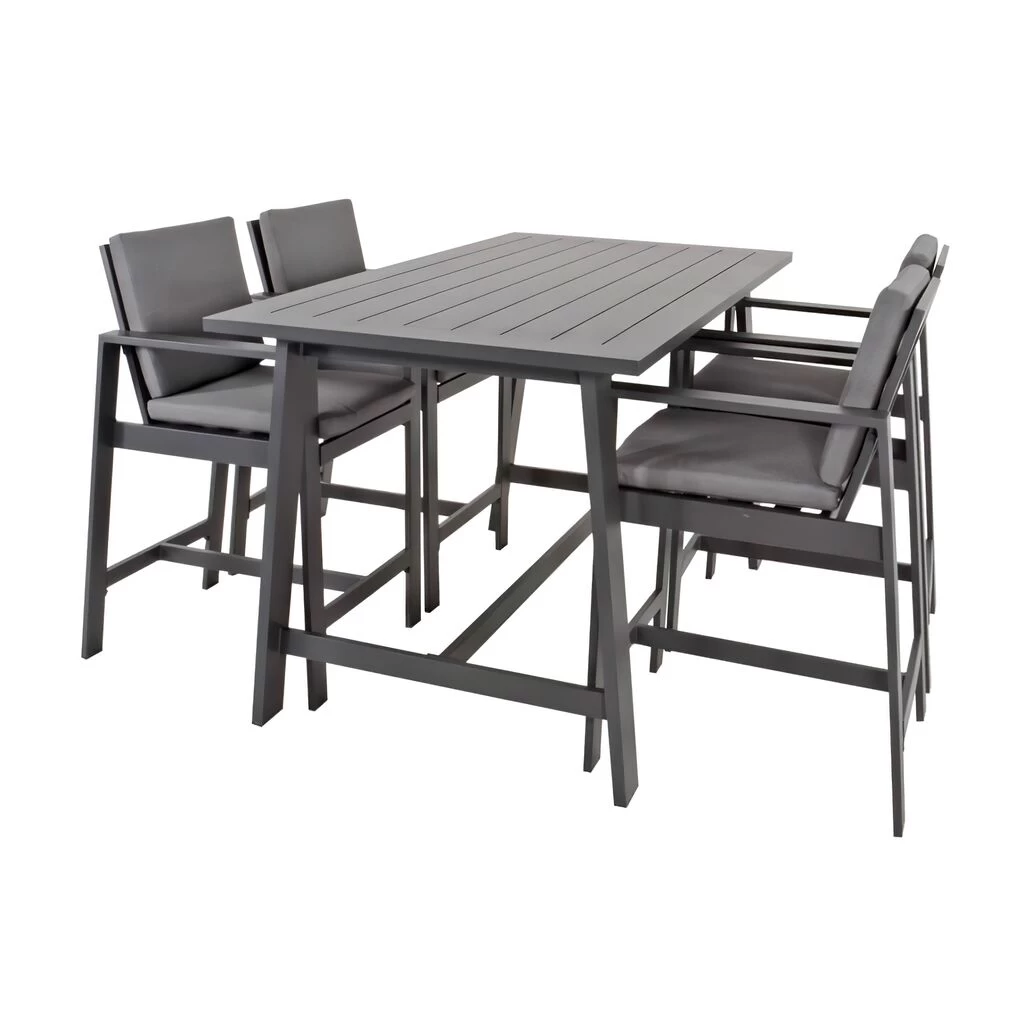 Dieser robuste Gartenstuhl wird unter ständiger Qualitätskontrolle aus Aluminium gegossen und erhält eine graue Beschichtung. Das Outdoor-Möbelstück ist robust und wetterfest. Die dicken Olefin-Auflagen sorgen für einen angenehmen Sitzkomfort. Das Inlay wird aus einem Baumwoll-Schaumstoff-Gemisch gebildet. Zur Reinigung sind Wasser und ein Schwamm ausreichend. Von säurehaltigen Reinigungsmittel wird abgeraten. Diese können die Oberfläche schädigen und zu einem Verlust der Wetterbeständigkeit führen.