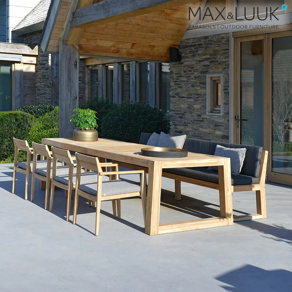 Die Möbel der Reihe ALEC des Gartenmöbelherstellers Max & Luuk werden aus Teakholz gefertigt. Im Freien ändert das Holz im Laufe der Zeit seinen Farbton und wird silbergrau, da die Pigmente in der Oberflächenschicht des Holzes verblassen. Jedes Stück Teakholz ist ein Naturprodukt und hat eine individuelle Struktur. Durch Wettereinflüsse, starke Temperaturschwankungen oder eine Änderung des Feuchtigkeitgehaltes im Holz, können Risse auftreten. Dieses „Schwinden“ ist ein natürlicher Vorgang, welcher keinerlei Einflüsse auf die Qualität des Gartenmöbels hat. Drei bis vier Mal im Jahr sollte das Holzmöbel mit einem Teak Cleaner von Schmutz befreit werden. Die Verwendung eines Hochdruckreinigers wird nicht empfohlen. Mit einem Teak Protector kann das Holz vor Flecken, zum Beispiel von Speisen oder Getränken, geschützt werden. Im Winter können Teakholzmöbel an einem trocknen Ort gelagert werden.