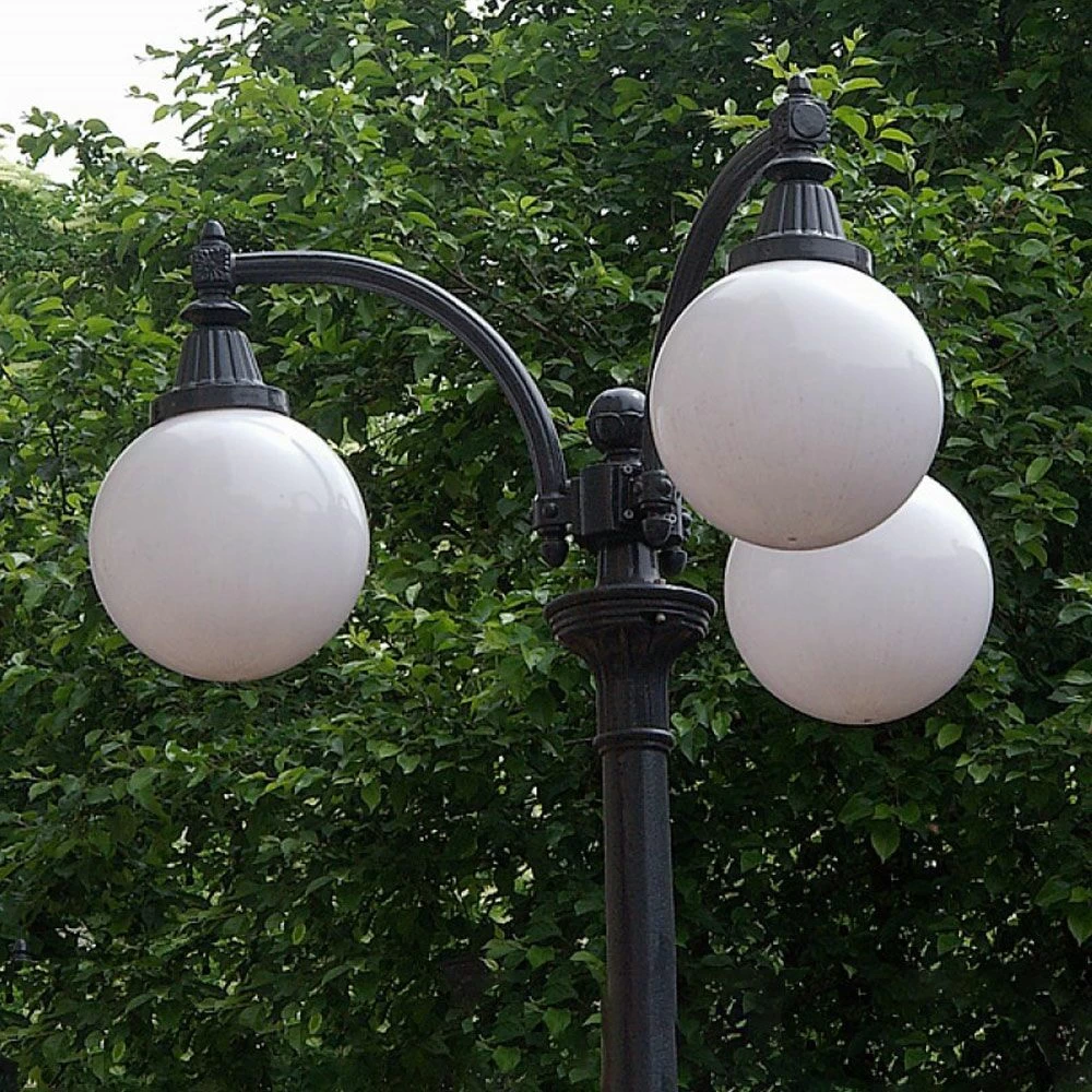Die Gehweglaterne aus Gusseisen mit antiken Dekoelementen und drei Kugelleuchten ist wetterfest und langlebig. Der Mast hat einen innenliegen Stahlkern, wodurch Stabilität geschaffen wird. Befestigt wird die Leuchte über den Flansch. Die Lieferung erfolgt zerlegt.