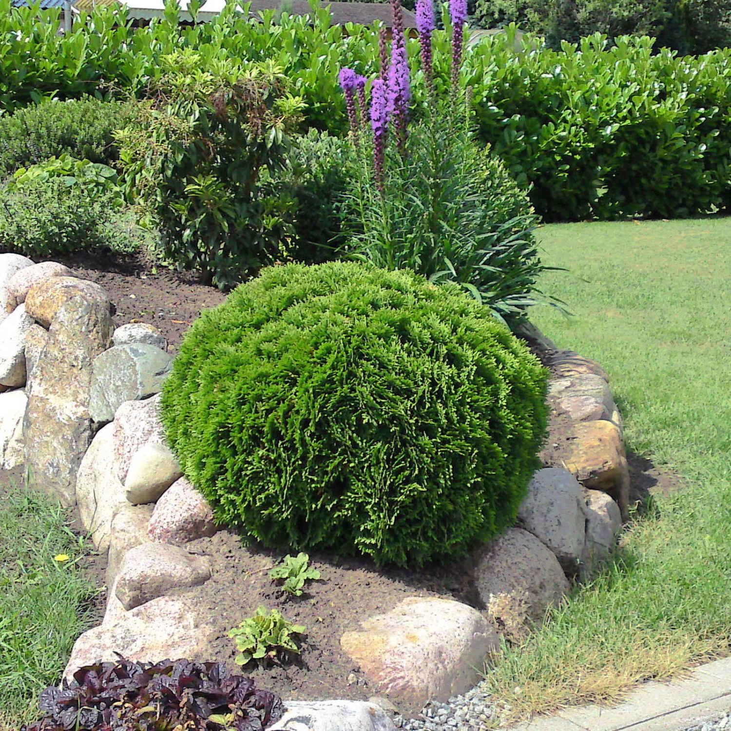 Mit einer maximalen Wuchshöhe von rund 100 Zentimetern gehört der immergrüne Lebensbaum ‚Mecki‘® zu den kleinen Thuja-Arten. Der ‚Mecki’® ist hervorragend schnittverträglich und lässt für Ihre Gestaltungswünsche viel Raum. Diese Thuja fühlt sich an sonnigen und halbschattigen Standorten und in nährstoffreichen Böden wohl. In einem Kübel, im Steingarten, als pflegeleichte Grabbepflanzung oder als Teil einer niedrigen, dekorativen Hecke macht der Lebensbaum ‚Mecki’® eine gleichermaßen harmonische Figur. Mit seiner natürlichen, kompakten Kugelform eignet er sich hervorragend als Formgehölz.