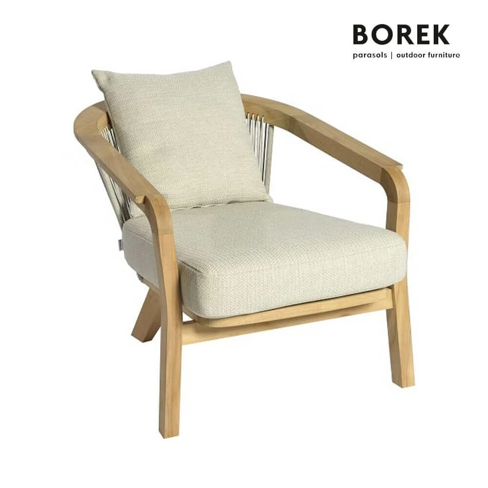 Die Gartenmöbel des Herstellers Borek zeichnen sich durch eine dauerhafte Stabilität und ein modernes Design aus. Eine hochwertige Auswahl des Teakholzes gibt dem Möbelstück eine hohe Stabilität. Hinzu kommen robuste Materialien für die Bespannung. Der Gartensessel ist frost- und hitzbeständig sowie pflegeleicht. Kleine Risse im Holz, welche sich im Laufe der Zeit bilden, sind normal und der Gartenstuhl verliert hierdurch nichts an Robustheit. Neben Gartenstühlen bietet der Hersteller auch Loungemöbel, Gartenliegen und Sonnenschirme, die Sie ebenfalls in unserem Shop online bestellen können. Das Ardenza-Seil kann mit dem Borek Fabric Cleaner gerinigt und mit dem Borek Fabric Protector geschützt werden. Für die Reinigung und Pflege des Teakholzes empfehlen wir Borek Teak Cleaner und Borek Teak Protector sowie Borek Teak Sealer. Hierdurch kann auch ergrautes Holz wieder zum Strahlen gebracht werden.