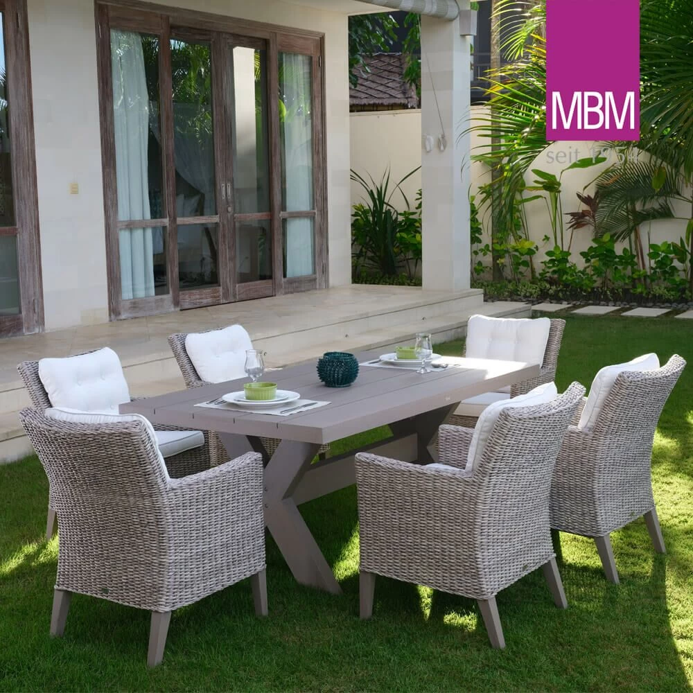 Dieser robuste und gemütliche Gartensessel aus dem Hause MBM ist ein Fest für die Sinne. Aus wetterfesten Materialien gefertigt, ist der Sessel hervorragend für Garten und Terrasse geeignet. Ein Gestell aus rostbeständigem Aluminium sorgt für Stabilität und Leichtigkeit. Die Stuhlbeine sind aus Resysta gefertigt, einem besonders robusten Material, das auch als das bessere Holz bezeichnet wird und in Haptik und Aussehen an dunkles Tropenholz denken lasst. Die Rückenlehne, die Sitzfläche und die Armlehnen sind aus dem ebenfalls eigens von MBM entwickelten Mirotex-Geflecht gefertigt, das wie natürliches Rattan wirkt und dabei absolut witterungsbeständig ist. Die hellbraunen Tabak- und Cognac-Farbtöne harmonieren perfekt mit der natürlichen Umgebung des Gartens.