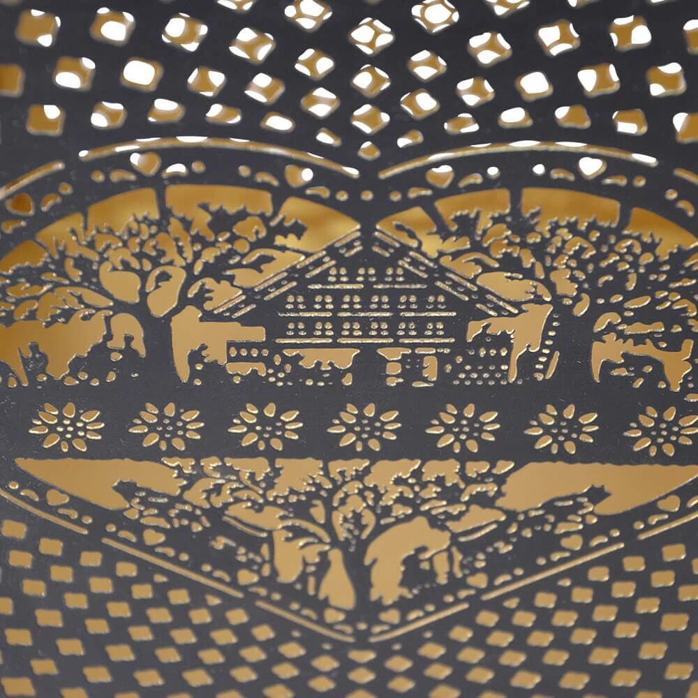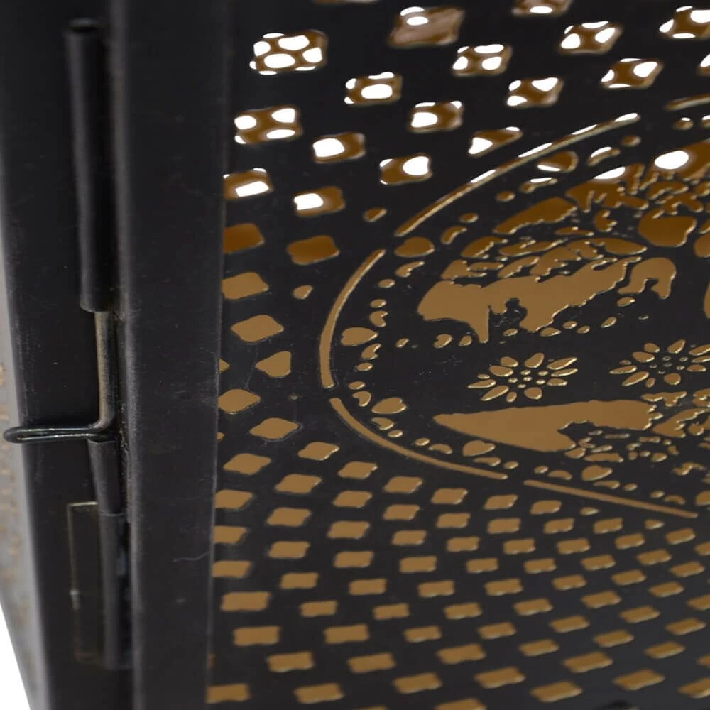 Diese außergewöhnliche Gartenlaterne wird unter ständiger Qualitätskontrolle aus Metall gefertigt. Die schwarze Oberfläche ist pulverbeschichtet und wird durch eine goldene Färbung im inneren stilvoll abgesetzt. Das Outdoor-Dekoelement ist beständig gegenüber Feuchtigkeit. Zur Reinigung sind Wasser und ein Schwamm ausreichend. Von säurehaltigen Reinigungsmittel wird abgeraten.