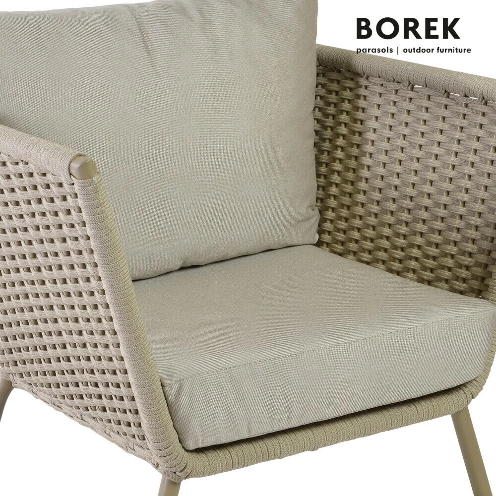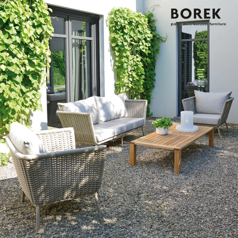 Der Garten Loungesessel VALLDEMOSSA des bekannten Gartenmöbel Herstellers BOREK überzeugt mit hochwertiger Verarbeitung und modernem Design. Das aus pulverbeschichtetem Aluminium gefertigte Gestell ist mit einem thermoplastischem Seil umwickelt. Die bequemen Polster Kissen sind bereits im Lieferumfang enthalten und laden zu entspannten Stunden im Garten ein. In Kombination mit dem passenden Gartensofa und einem Gartentisch lassen sich ansprechende Gartenmöbel Ensemble zusammenstellen. Bestellen Sie noch heute online auf GARTENTRAUM und wir liefern den Gartensessel versandkostenfrei (innerhalb Deutschland) zu Ihnen nach Hause.