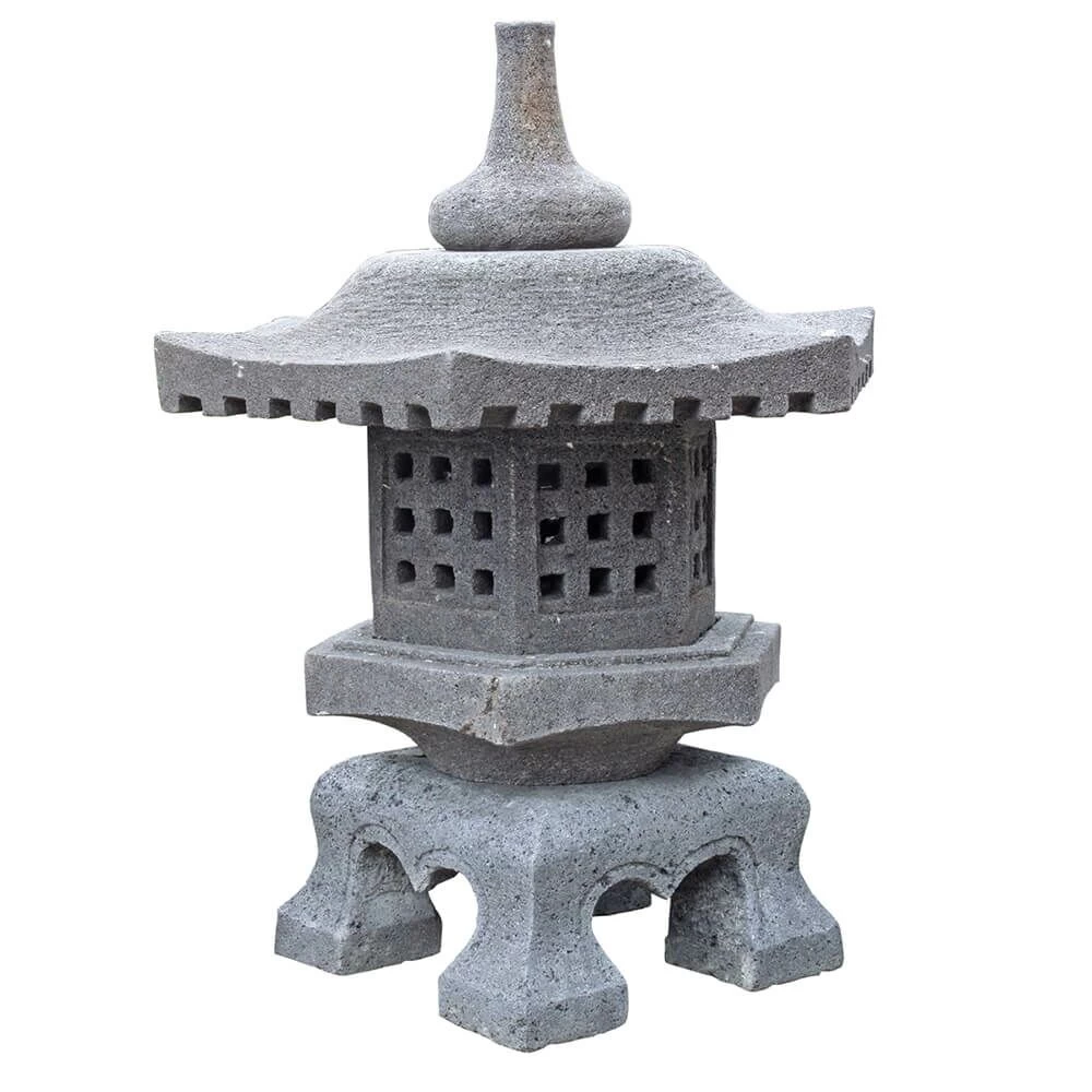 Nach Überlieferungen standen schon im 16. Jahrhundert Laternen vor japanischen Tempeln von Göttern. Typisch für die Laternen sind die geschwungen Dächer und die reich verzierten Säulen. An dem richtigen Fleck im Garten platziert, ist sie ein besonderer Blickfang. Hergestellt wird Sie nach traditionellen Techniken in unserer Bildhauerwerkstatt. Als Vorlage dienen historische Skizzen. Durch eingeschlossene Tonminerale erhält der verwendete Andesit seine charakteristische Farbe. Die kleinen bis mittelgroßen Einschlüsse sind ein auffallendes Merkmal und kennzeichnend für die hochwertige Qualität des Natursteins. Dadurch sind die Natursteinobjekt besonders witterungsbeständig und frostfest. Sie sollten jedoch vor Streusalz geschützt werden.