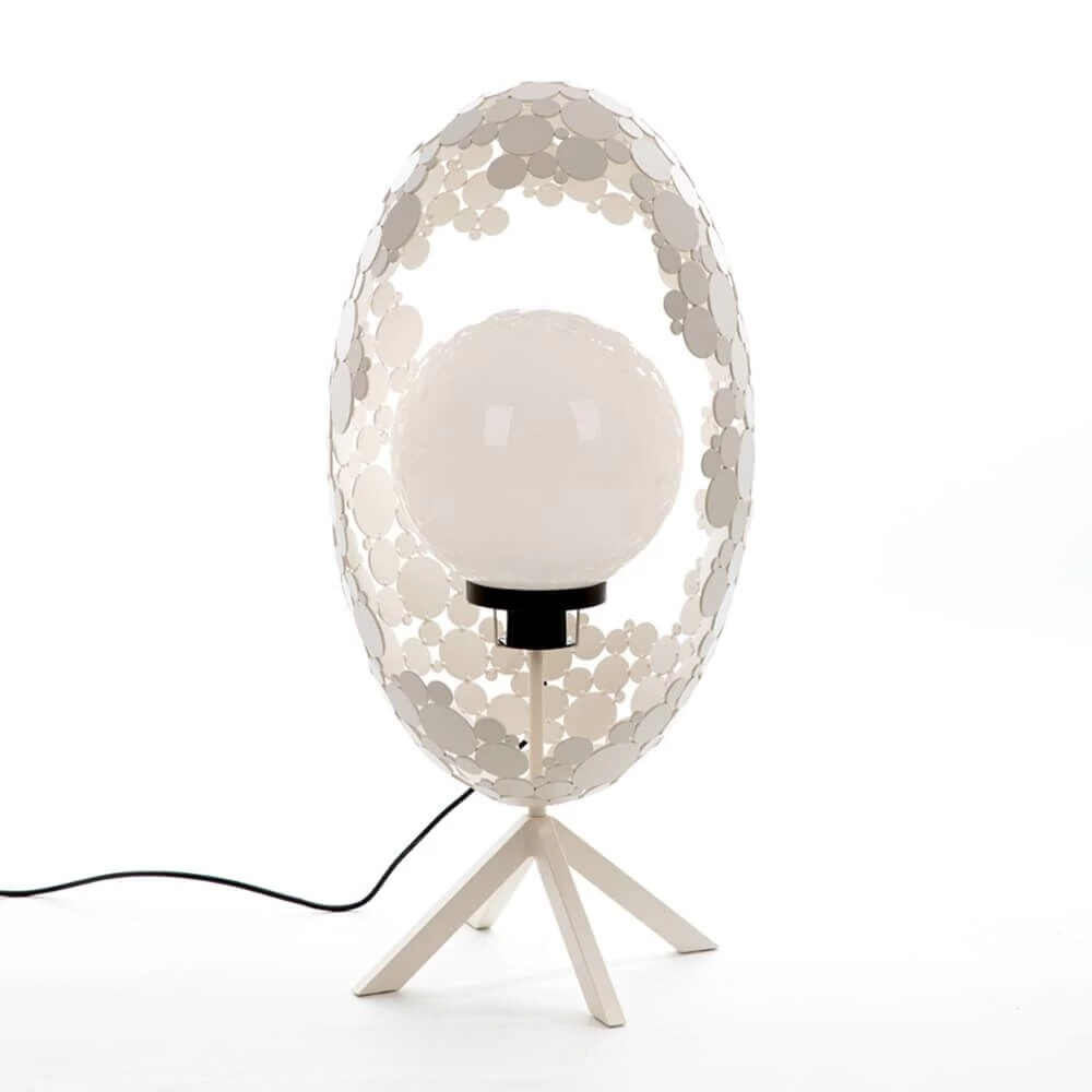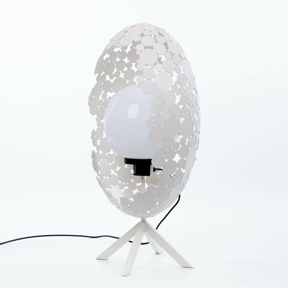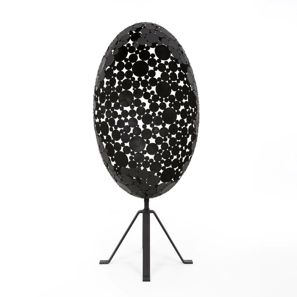 Inspiriert von den Formen der Natur erschafft Claudius Sutschek Kunstwerke, die zugleich einen praktischen Nutzen besitzen. Der kokonförmige Korpus dieser Lampe steht für das Wiederkommen von Neuem und für die Verwandlung der Raupe zum Schmetterling. In liebevoller Handarbeit entstehen Unikate, für die jedes Metallplättchen einzeln aneinandergeschweißt wird. Der Betrachter wird in eine angenehme Atmosphäre gehüllt und entdeckt immer wieder neue Blickwinkel. Wählen Sie zwischen schwarz, weiß oder rot lackierten Metall. Dieses ist pulverbeschichtet und verzinkt.