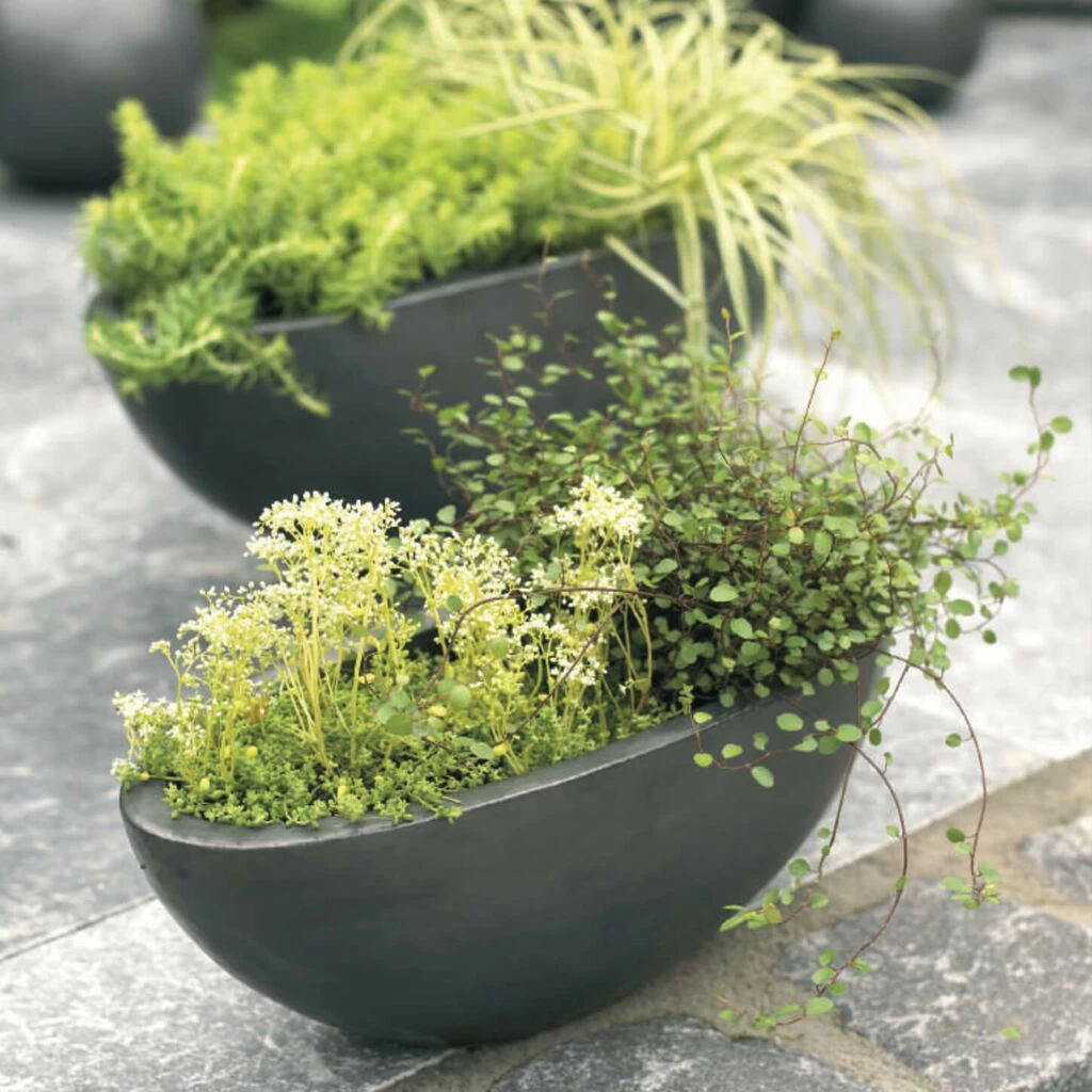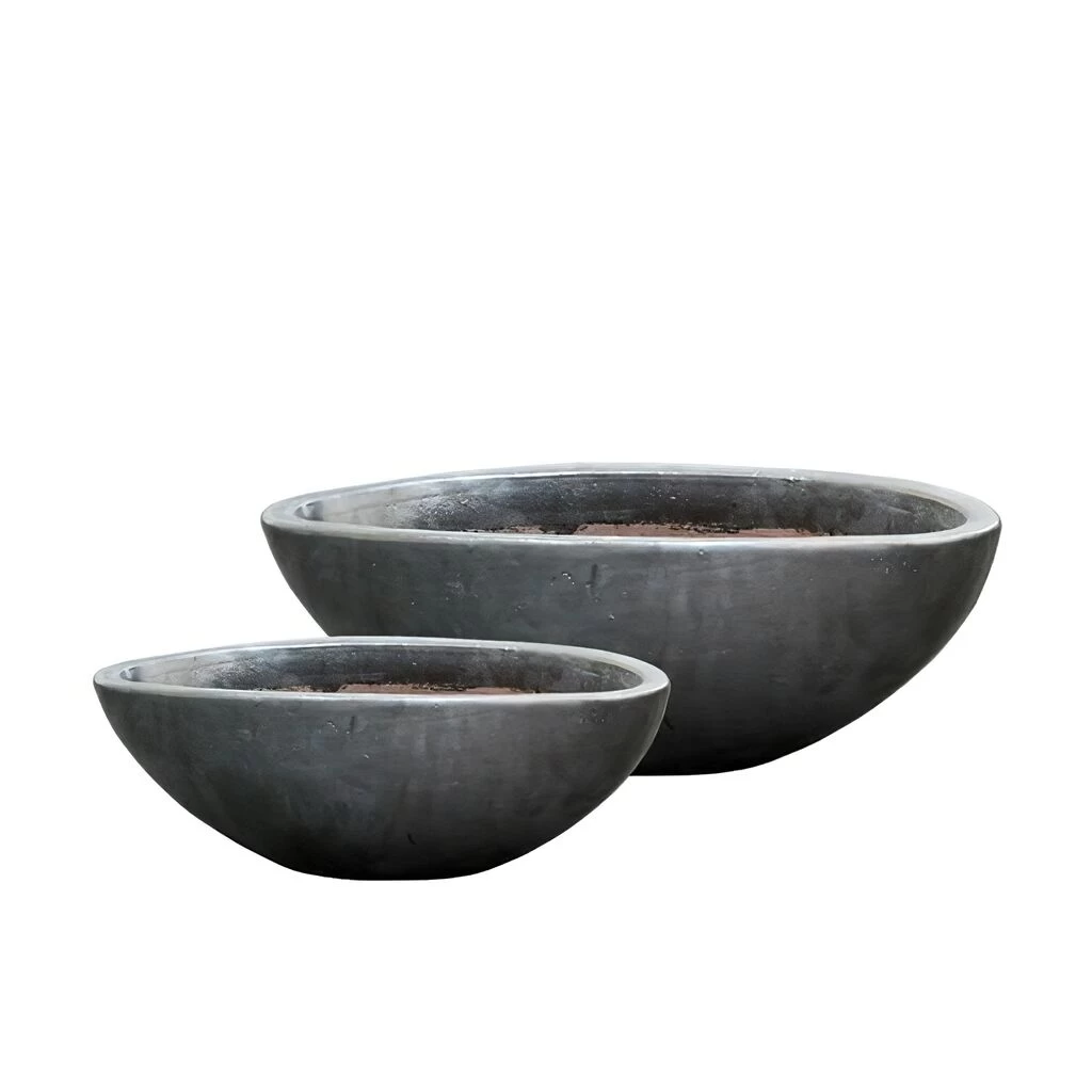Moderne ovale Pflanzschalen aus glasierter Keramik in Anthrazit matt. Im Lieferumfang enthalten sind 2 Schalen mit den Maßen15x40x20cm und 21x55x28cm (HxBxT). Farbliche Abweichungen sind möglich.