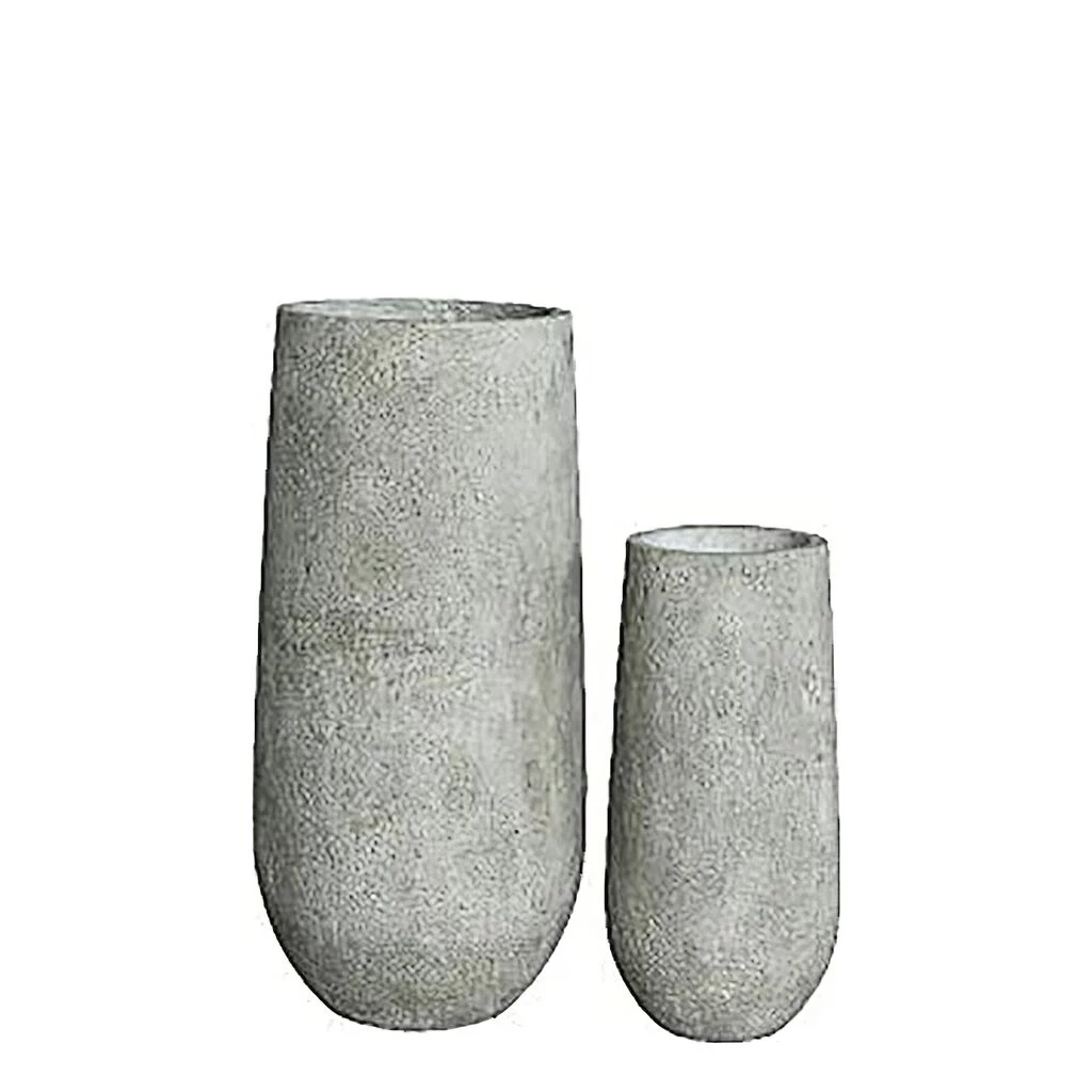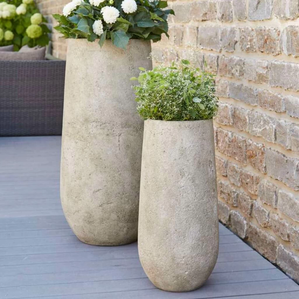 Hierbei handelt es sich um ein Set bestehend aus zwei Pflanzvasen in Steinoptik für den Garten. Im Lieferumfang enthalten ist jeweils eine Vase mit den Maßen 64x30cm und 92x44cm (HxDm). Das verwendete Material steht optisch echtem Stein in nichts nach, ist aber im Vergleich leichter zu bewegen.