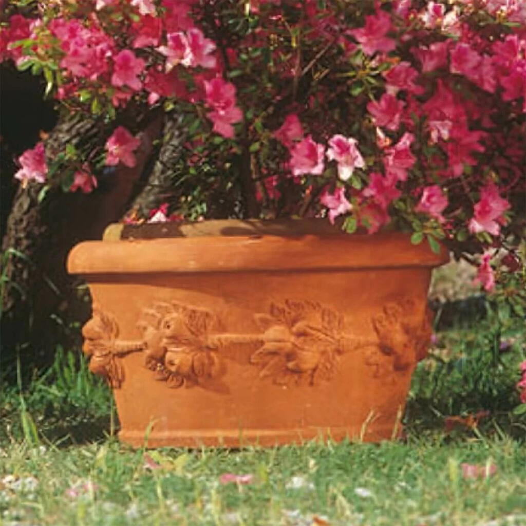 Dieser außergewöhnliche Blumenkübel wird liebevoll im traditionellen Handwerk gefertigt und mit einem floralen Muster versehen. Aufgrund der hohen Frostbeständigkeit der Terrakotta ist das Pflanzgefäß der optimale Begleiter im Garten oder auf der Terrasse. Im Boden befindet sich ein kleiner Wasserablauf.