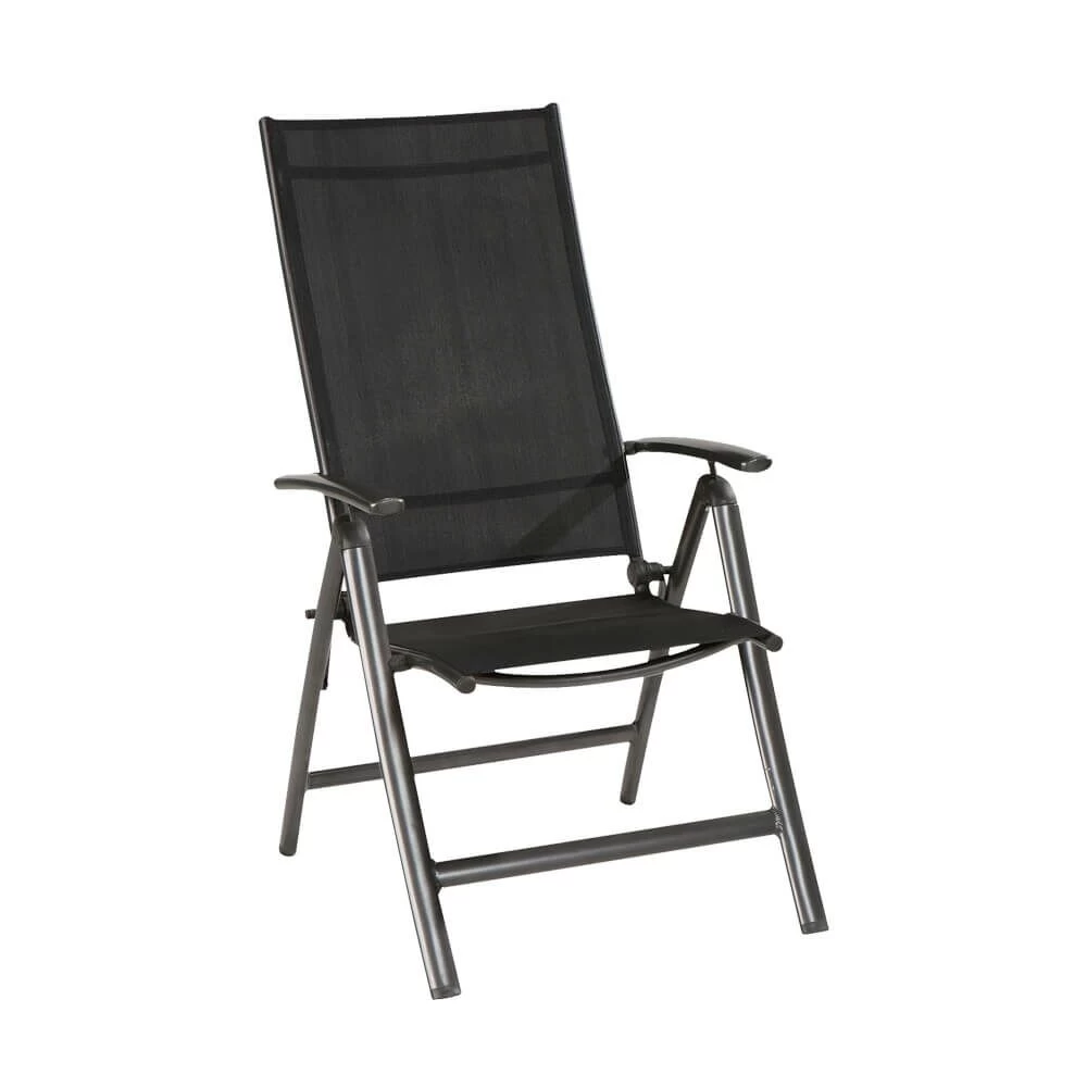 Dieser robuste Gartenstuhl wird unter ständiger Qualitätskontrolle aus Aluminium gegossen und erhält eine anthrazitfarbene Pulverbeschichtung. Die Sitzfläche wird durch ein schwarzes Textylen-Gewebe aufgespannt. Eine in mehreren Stufen verstellbare Rückenlehne erhöht den Sitzkomfort. Das Outdoor-Möbelstück ist wetterfest. Zur Reinigung sind Wasser und ein Schwamm ausreichend. Von säurehaltigen Reinigungsmittel wird abgeraten. Diese können die Oberfläche schädigen und zu einem Verlust der Wetterbeständigkeit führen.