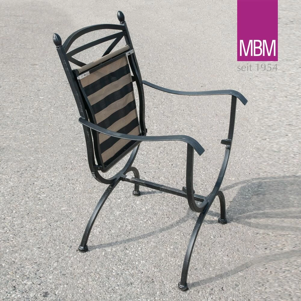 Nicht nur für Freunde der antiken Gartengestaltung sind diese Möbel ein besonderes Highlight. Sie werden aus massivem Schmiedeeisen gefertigt und zaubern mit dezent antiken Einflüssen ein romantisches Flair auf Balkon, Terrasse und in den Garten. Hinter dem mediterran angehauchten Design verbirgt sich modernste Technik. Die Gestelle bestehen aus galvanisch verzinktem Eisen, zum Schutz mit einer antik schwarzen Pulverbeschichtung versehen wurde. Für Sitzkomfort sorgt die schwarz gestreifte textilene Bespannung.