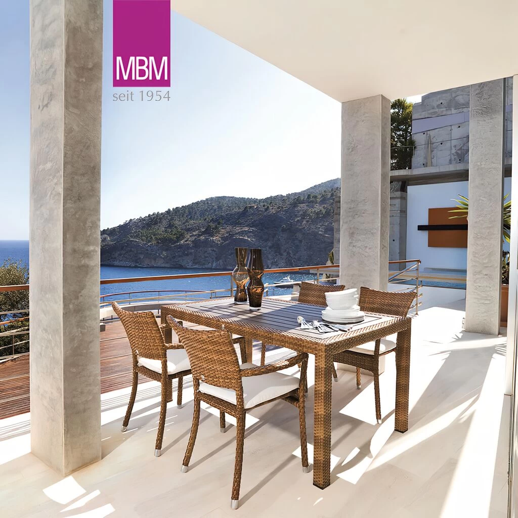Möbel aus Resysta sehen aus wie Holz und fühlen sich an wie Holz. Das Versprechen von MBM lautet: Für die Herstellung dieser Möbelstücke muss kein einziger Baum gefällt werden. Das Material wurde bereits mit verschiedenen Preisen ausgezeichnet, es ist witterungsbeständig, farbecht, pflegeleicht und sehr langlebig. Gartenmöbel aus diesem Material trotzen Feuchtigkeit, sodass die Oberfläche dauerhaft hält, nicht nachgeschliffen oder neu gestrichen werden muss. Außerdem ist Resysta recycelbar, kann also nach der Verwendung zerkleinert und erneut verwendet werden, wodurch ein unendlicher Kreislauf entsteht. Zu 60 Prozent besteht das Material aus Reishülsen, welche Reststoffe der Lebensmittelindustrie sind. Mirotex schafft eine stilvolle Atmosphäre in Ihrer Sitzecke. In Handarbeit werden ganze Fasern um ein Aluminiumgestell geflochten, was bis zu fünf Tage dauern kann. Helle Farblinien in jedem Faserstrang lassen das Material sehr natürlich wirken. Es ist UV-beständig und wetterfest.