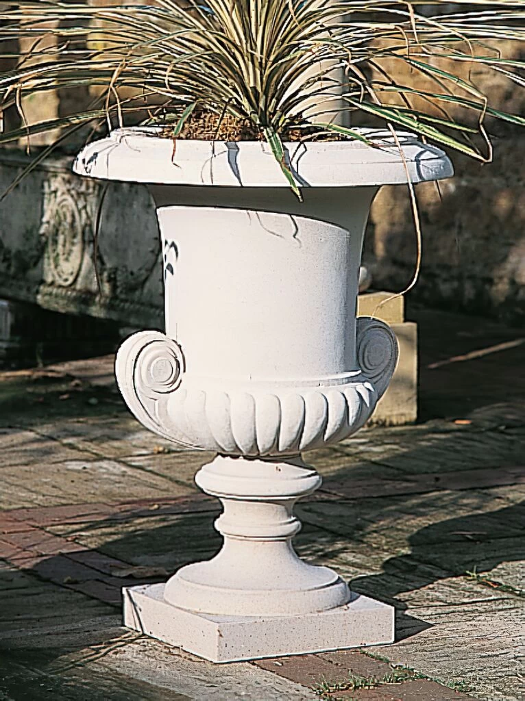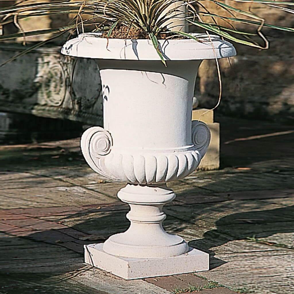 Diese antik gestaltete Gartenamphore aus Stein verleiht jeder Umgebung einen historischen Charme. Auf einem quadratischen Sockel stehend, zeichnet sich die Blumenvase durch eine kunstvolle Verarbeitung aus. Seitlich gehaltene schneckenhausförmig gewundene Ornamente zieren den antiken Steintrog. Egal ob auf einer freien Fläche stehend oder auf der Veranda thronend, diese Gartenamphore verleiht ihrer Umgebung Glanz und Harmonie. Aufgrund der besonderen Ausstrahlung ist die antike Steinamphore ein besonderes Accessoire für Wintergärten und Eingangsbereiche.