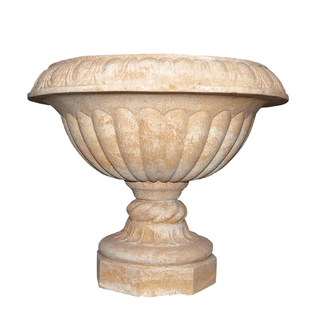 Dieses antike Pflanzgefäß fügt sich in viele verschiedene Gartendekorationen ein. Sei es eine Gartengestaltung im antiken, barocken oder mediterranen Design, dieser Pflanzkelch ist ein zeitloser Blickfang. Aus Sand Steinguss gefertigt, besticht der Blumentopf durch Unempfindlichkeit gegen Wettereinflüsse und Langlebigkeit.