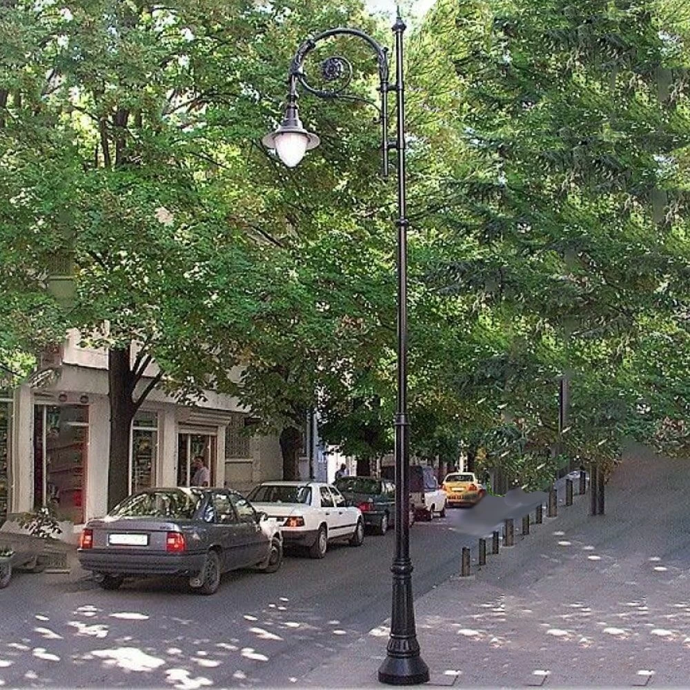 Im Vintage Stil gehalten, ist die Straßenbeleuchtung eine stilvolle Ergänzung für historische Städte. Gefertigt wird die Parklaterne aus Gusseisen. Durch ein innenliegenden Stahlkern mit Flanschplatte kann die Stadtleucht fest mit dem Boden verankert werden. Satandardmäßig bieten wir die Laterne mit einer Schirmlampe an. Auf Wunsch ist eine Kugelleuchte möglich. Die Lieferung erfolgt zerlegt.