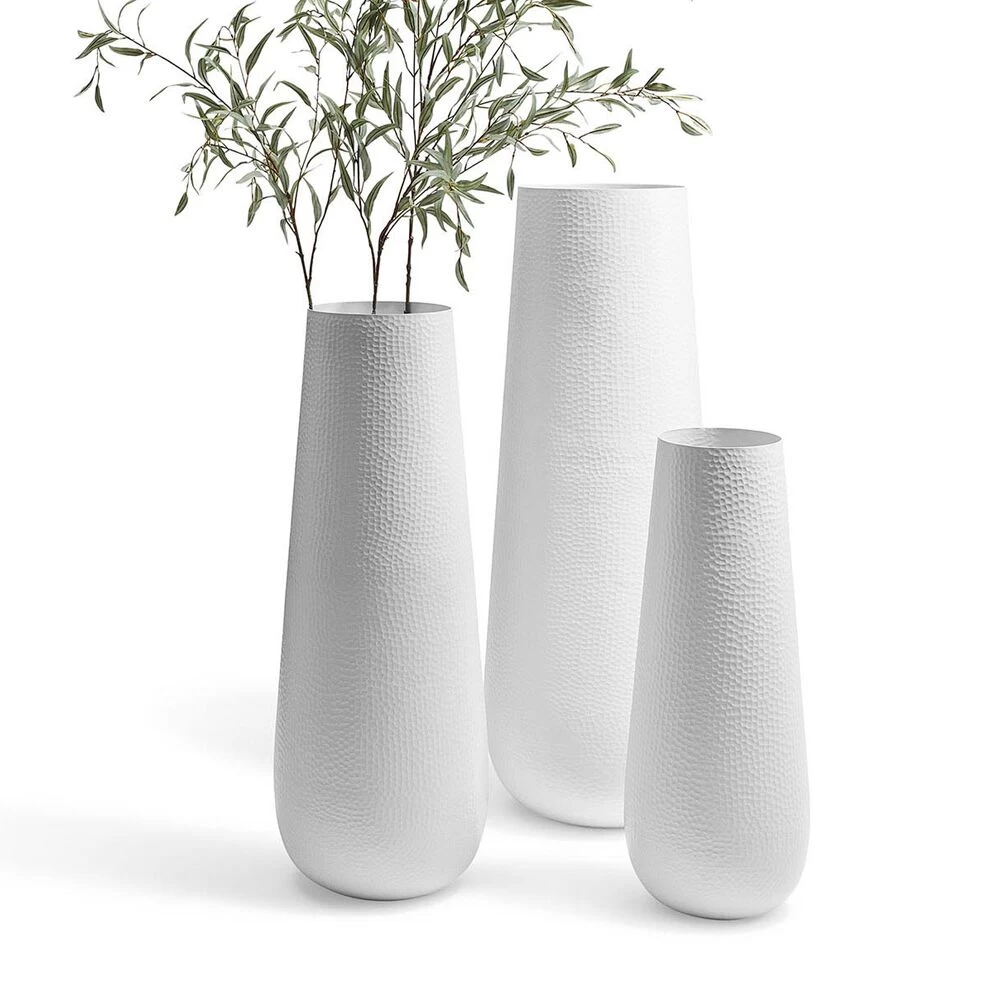 Die stilvollen Gartenvasen werden im 3er Set (80 cm, 100 cm, 120 cm) angeboten. Das Hammerschlag-Design führt zu einer besonderen Optik der weißen Aluminiumvasen.