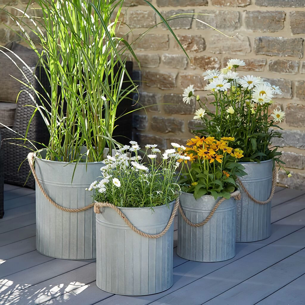 Die dekorativen Zink Kübel eignen sich als Deko- oder Pflanzgefäß für Garten und Terrasse. Im Lieferumfang enthalten sind vier Eimer in unterschiedlichen Größen (16×19, 20×24, 25×29, 30x34cm HxDm). Die attraktiven Kübel sind in zwei Farbvarianten erhältlich. Bitte beachten: die Eimer sind nicht feuerverzinkt und können bei Feuchtigkeit rosten. Sie sind außerdem nicht wasserdicht.