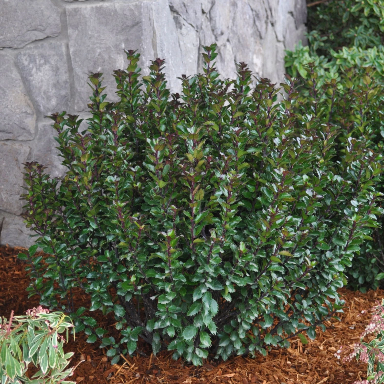 Der Ilex meserveae ‚Little Pirate’® (Ilex meserveae ‚Monnieves‘ (S) Scallywag TM USA) ist ein männlicher Ilex, der zierliche Blüten, jedoch keine Früchte bildet. Diese Stechpalme erreicht Wuchshöhen von bis zu 120 Zentimetern und lässt sich durch den Formschnitt Ihrem Geschmack entsprechend gestalten. Zum Bilden von blickdichten Hecken und Bepflanzen von Beeten ist der kleine Pirat unter den Stechpalmen hervorragend geeignet.
